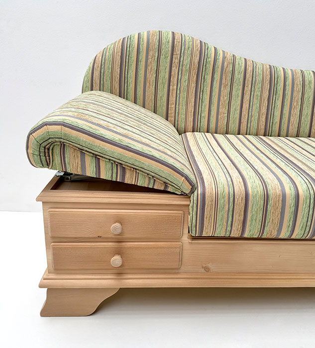 Abm: 195/75/86 cm, (L/T/H), Sitzhöhe 45 cm, Polsterung Komfort Kaltschaum, Kopfteil höhenverstellbar, Sitz mit Klappfunktion, Holzteile: Fichte , Stoffgruppe 1, im Bild Edmonton grün, Angebotsstoff: 100% Polyester, 18.000 Scheuertouren, lfm Stoff 140 cm Breite,
