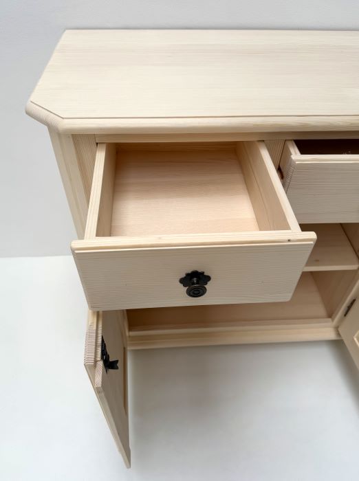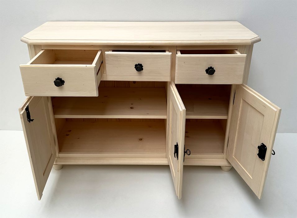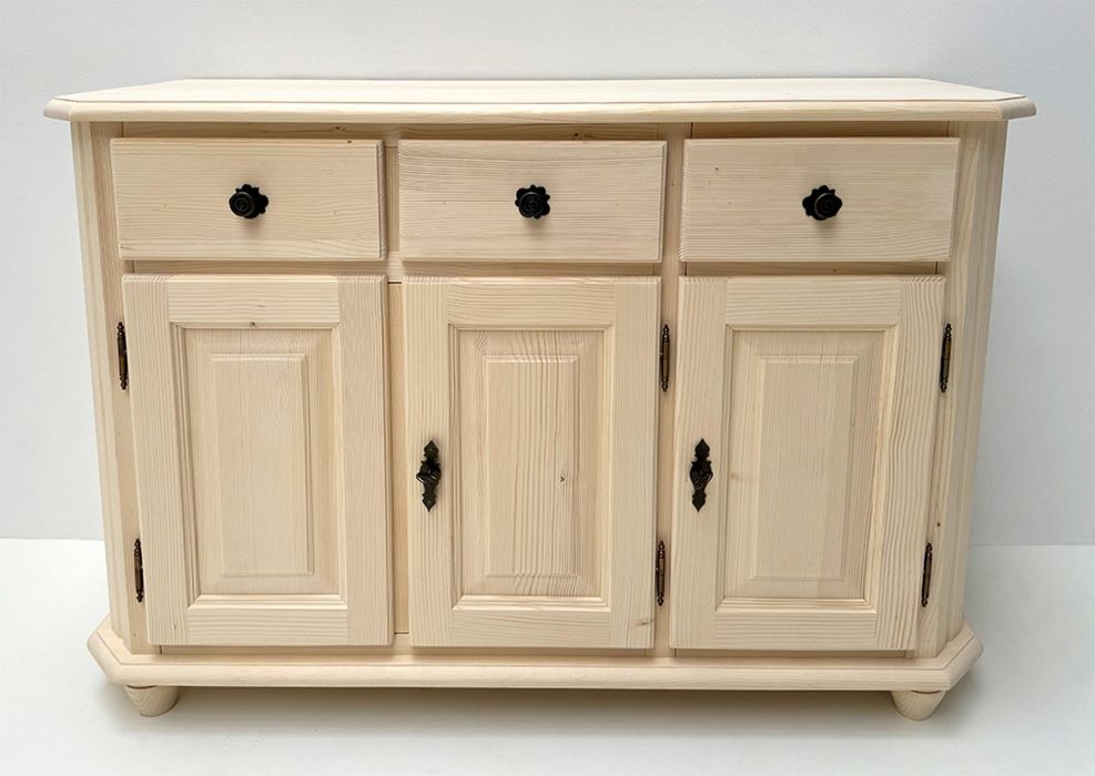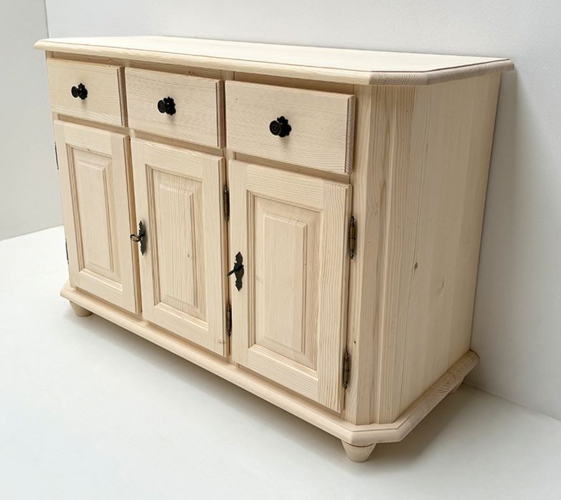 1 Anrichte Mod. Amberg 3-trg. / 3 Schubladen, 124/84/48 cm (B/H/T), Fichte roh