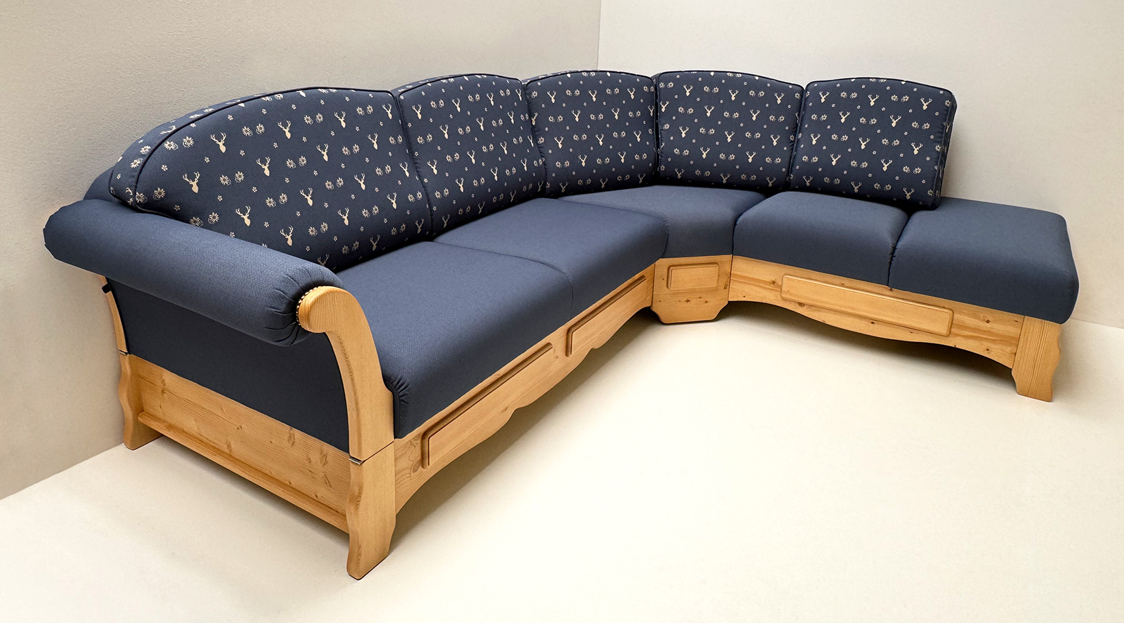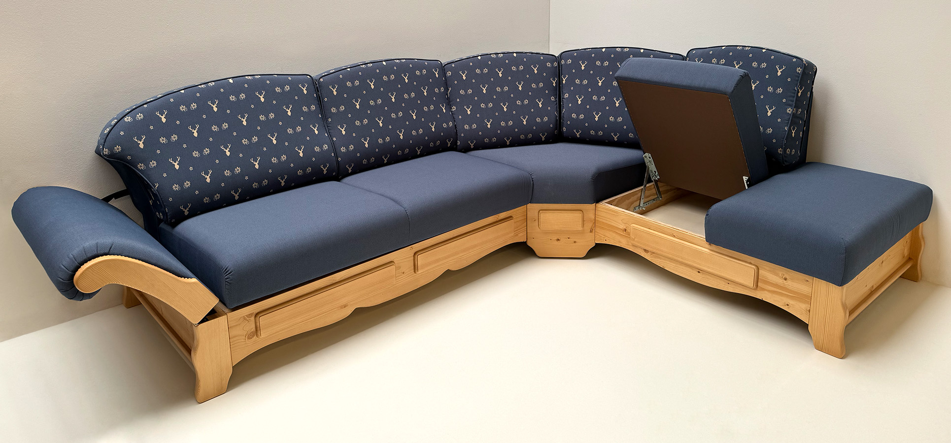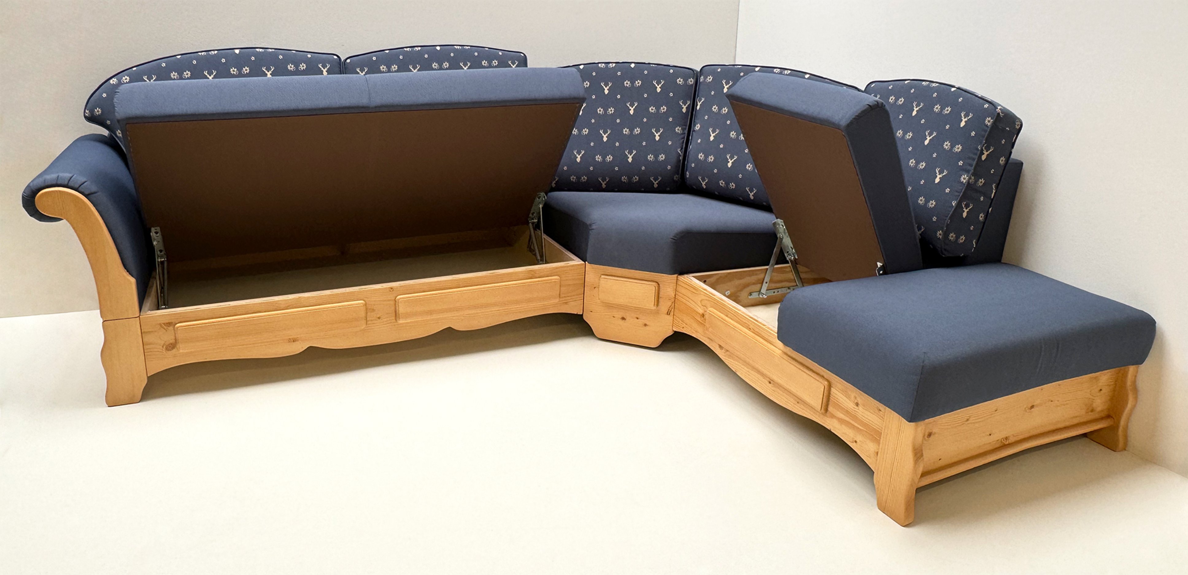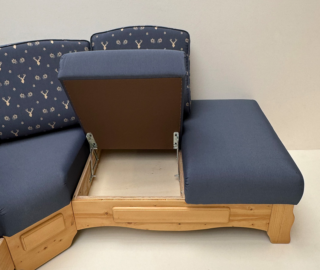 Eckbank Amberg klein 185/150 m.Truhe, Solo, Hartwachs, Polster genäht Landleben TS-3003, Hirsch blau