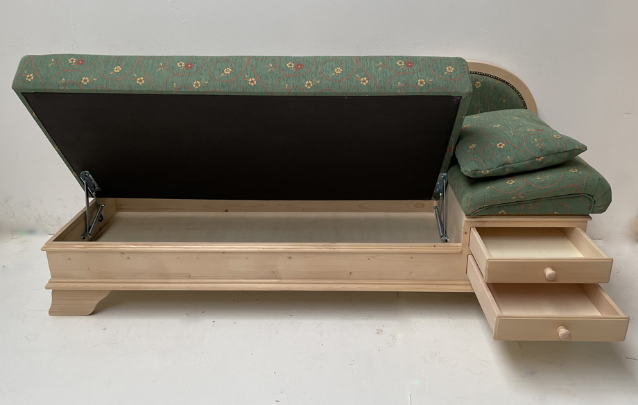Kopfteil wahlweise rechts oder links, Abm: 195/75/86 cm, (L/T/H), Sitzhöhe 45 cm, Polsterung Komfort Kaltschaum, Kopfteil höhenverstellbar, Sitz mit Klappfunktion, Holzteile: Fichte,