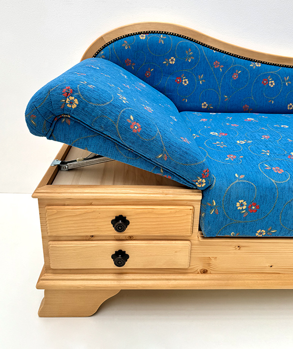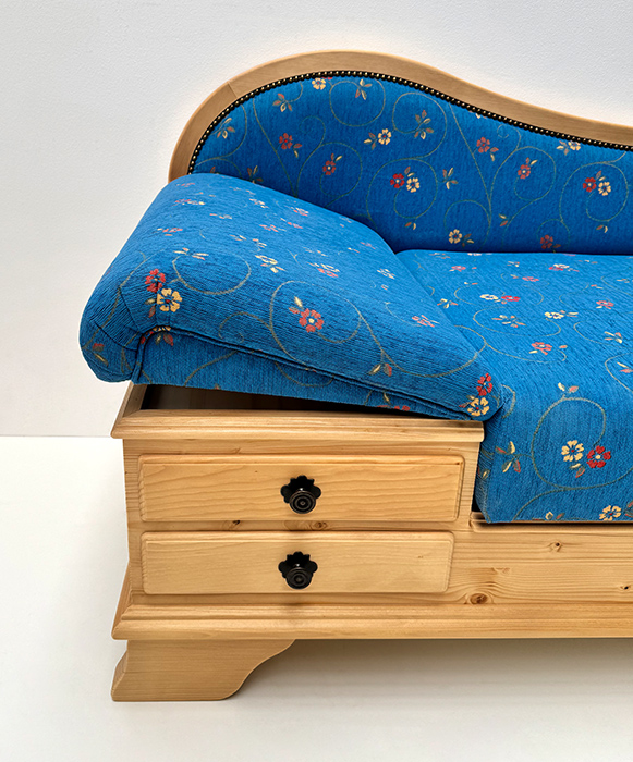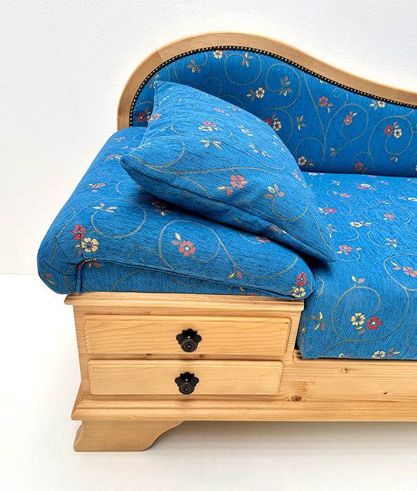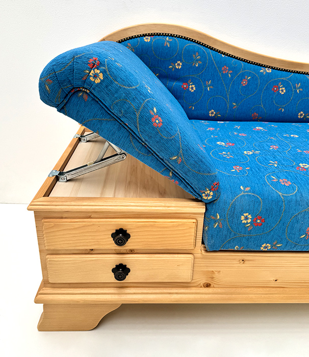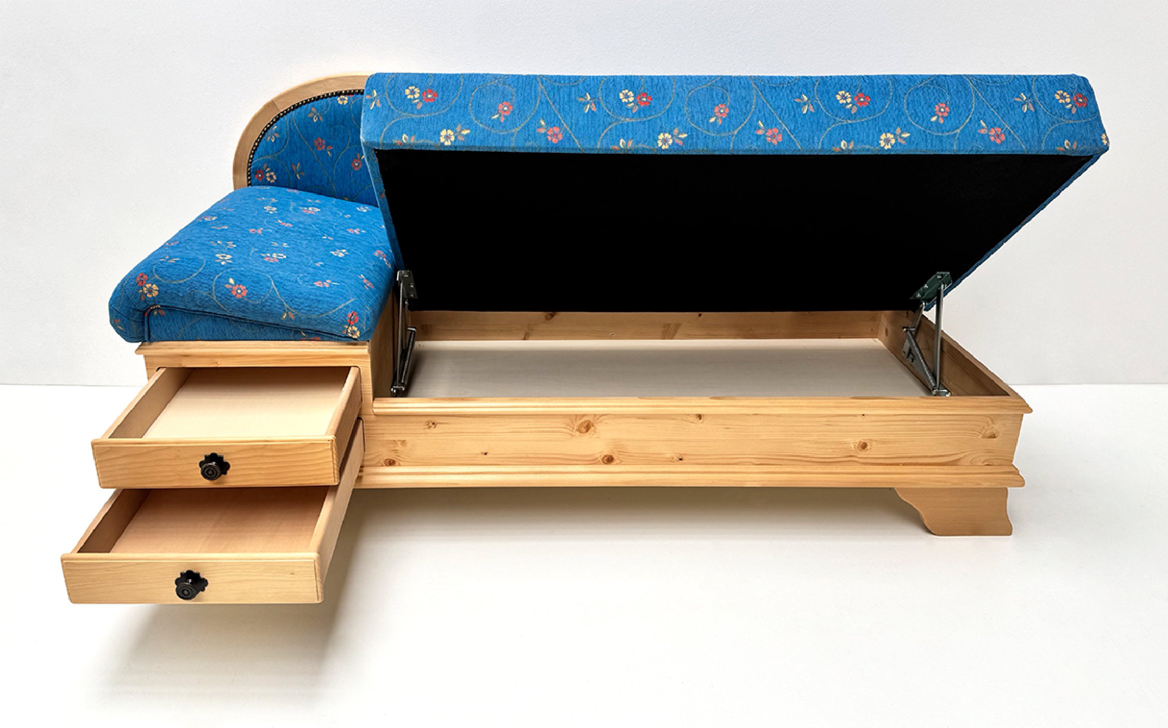 2 Schubladen, Kopfteil verstellbar, Sitz aufklappbar, Holz Fichte Rosner Hartwachs, Metallknöpfe