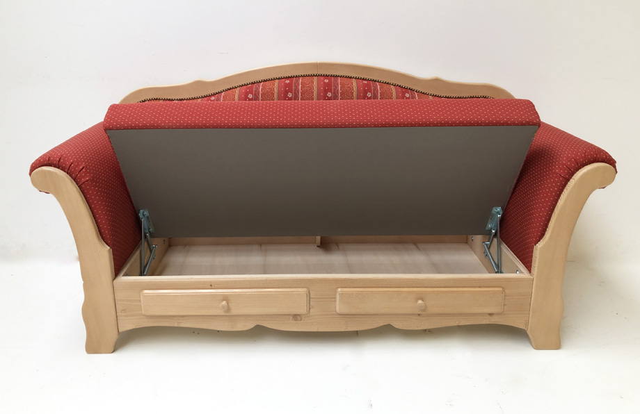 Rücken Holzrahmen, Sitz aufklappbar, Schubladenblenden vorne,