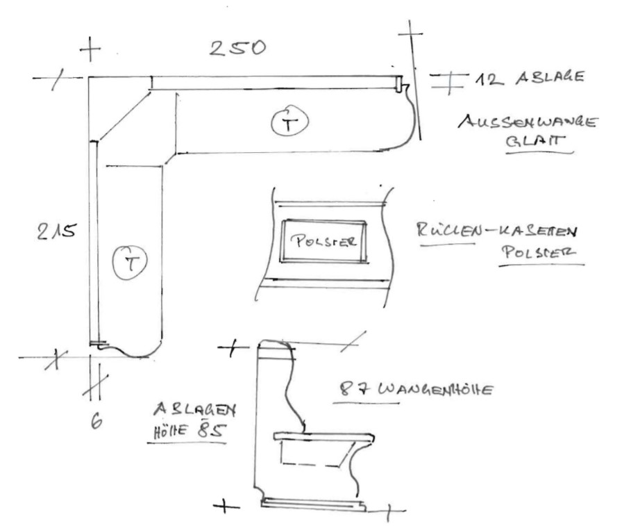 Wangenhöhe 89 cm, Ablagenhöhe 87 cm , Sitz und Wangenstärke 4 cm gerade Holzkasetten