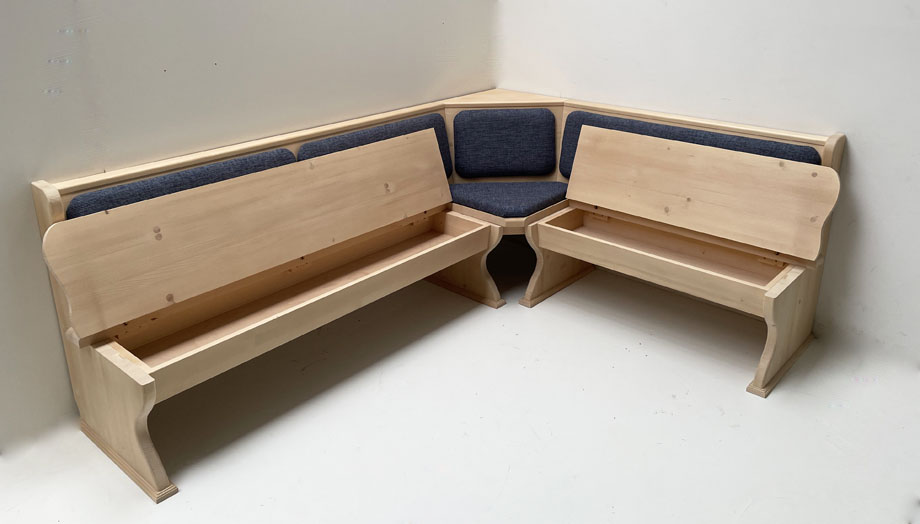1 Eckbank Schenkelmaß Stellmaß B >235/180 cm, mit Truhen, Aussenwangen geschnitzt