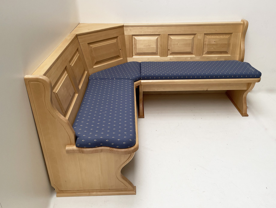 Eckbank Lindau 165/185  mit Truhen, Aussenwangen gerillt, Polsterplatten, Kundl blau