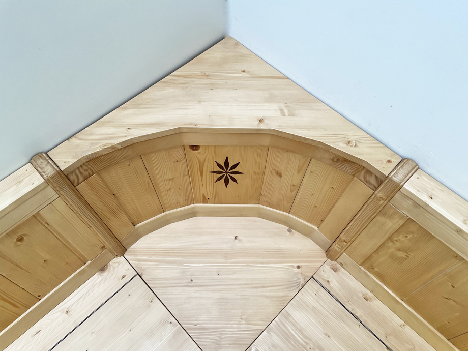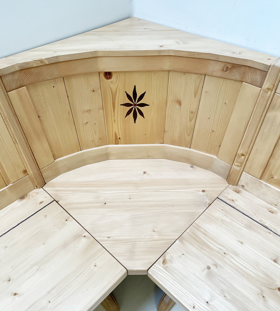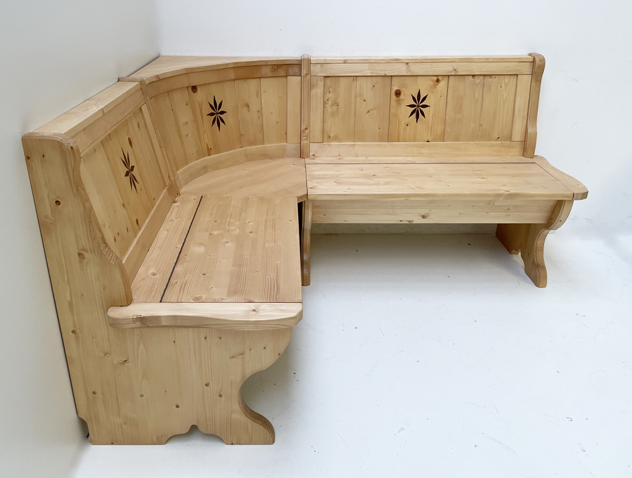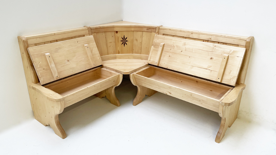 Eckbank Tirol, Sondermaß 140/165 cm, mit Truhen, Intarsien, Fichte Rosner lackiert