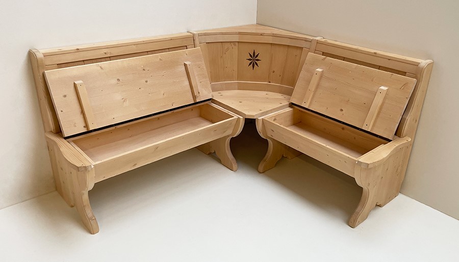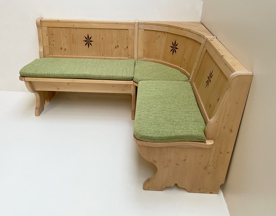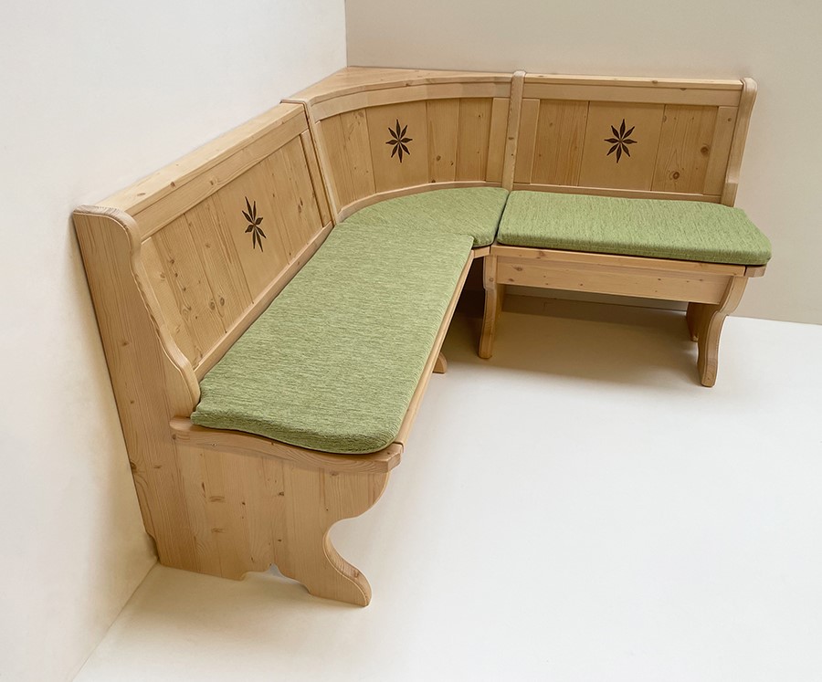 Eckbank Tirol, Sondermaß 165/140 cm, mit Truhen, Intarsien, Rosner gewachst, Polster Landshut grün