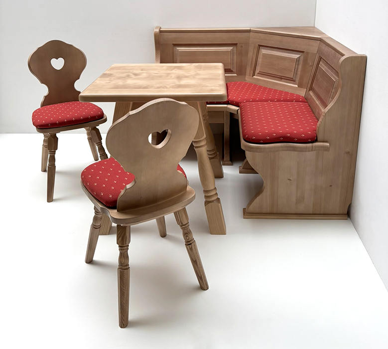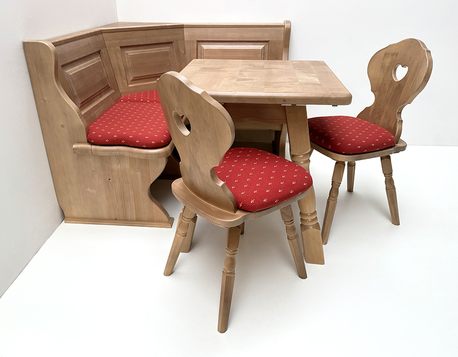 Eckbankgruppe LINDAU 125/125 Fichte, Tisch 70/70 , 4510-Amberg, Stühle Vienna, Polster Kundl rot