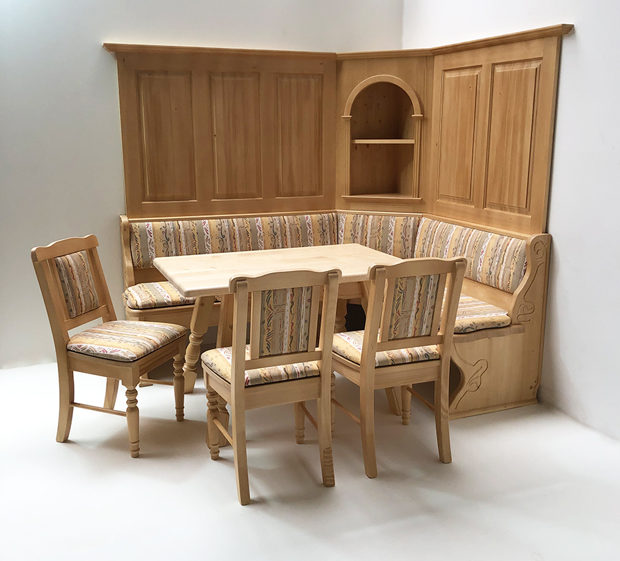 Eckbankgruppe Lindau 195/165cm, Truhen, Wandverkleidung, geschnitzt, Vollpolster, Pocking beige