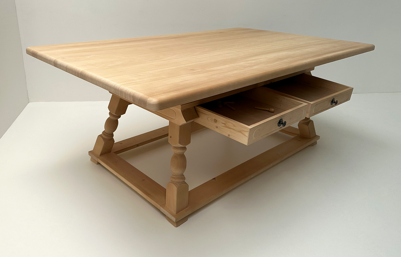 Landhausmöbel Jogltisch Modell 4730, mit 2 Schubladen, Fichteplatte 120/200 cm, Stärke 4 cm