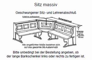 Eckbank Alpenland, Sitz massiv Geschwungener Sitz- und Lehnenabschluss. Auf Wunsch auch mit geradem Sitz und Lehnenabschluss. In Eiche und in Fichte Lieferbar! Gesamthöhe: 850mm Gesamttiefe: 600mm Sitzhöhe: ca.470mm Sitztiefe 450mm Lieferbare Außenmaße: 1490 x 1680mm 1490 x 1890mm 1680 x 1680mm 1680 x 1890mm 1680 x 2090mm 1890 x 1890mm 1890 x 2090mm 2090 x 2090mm