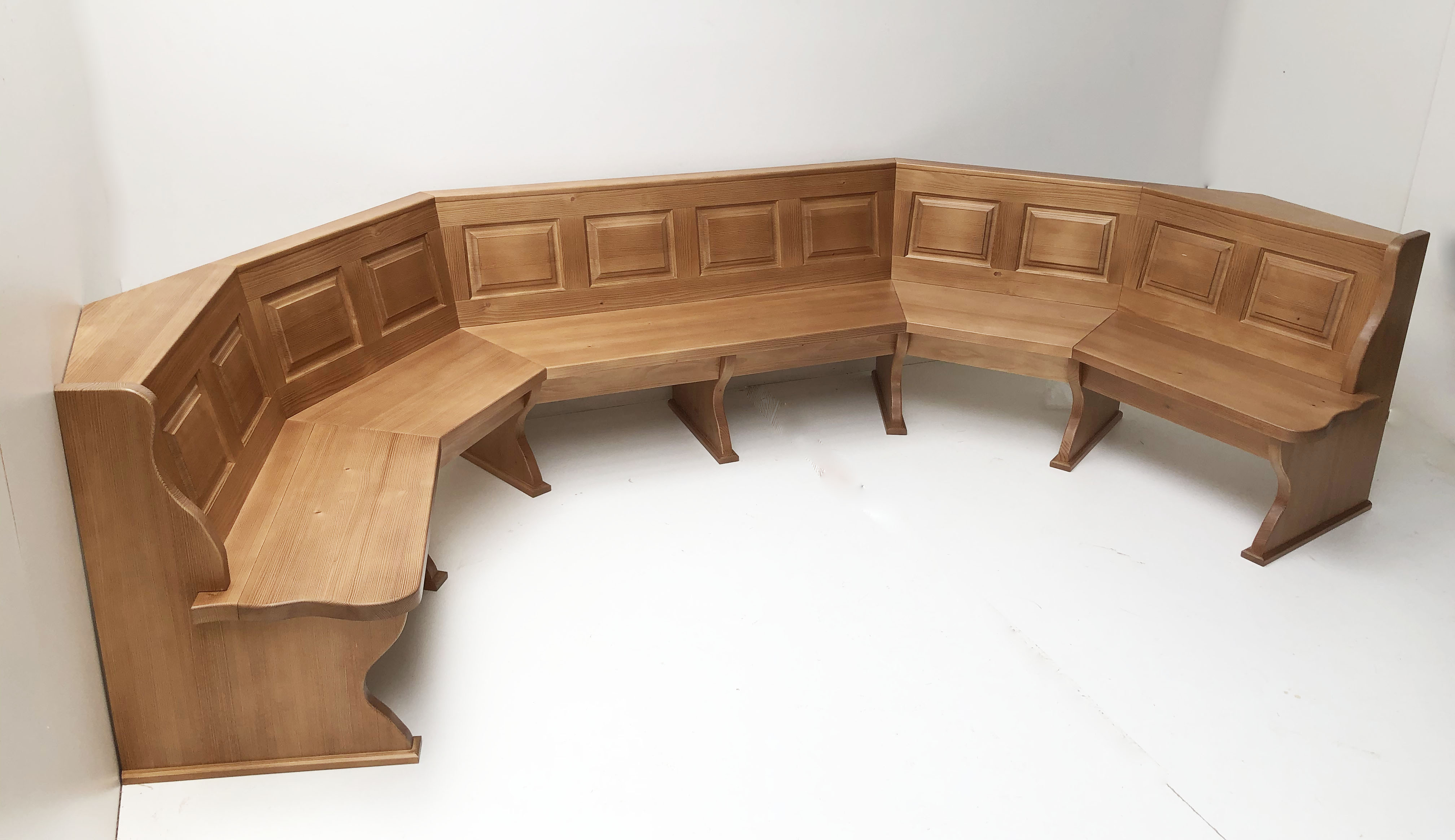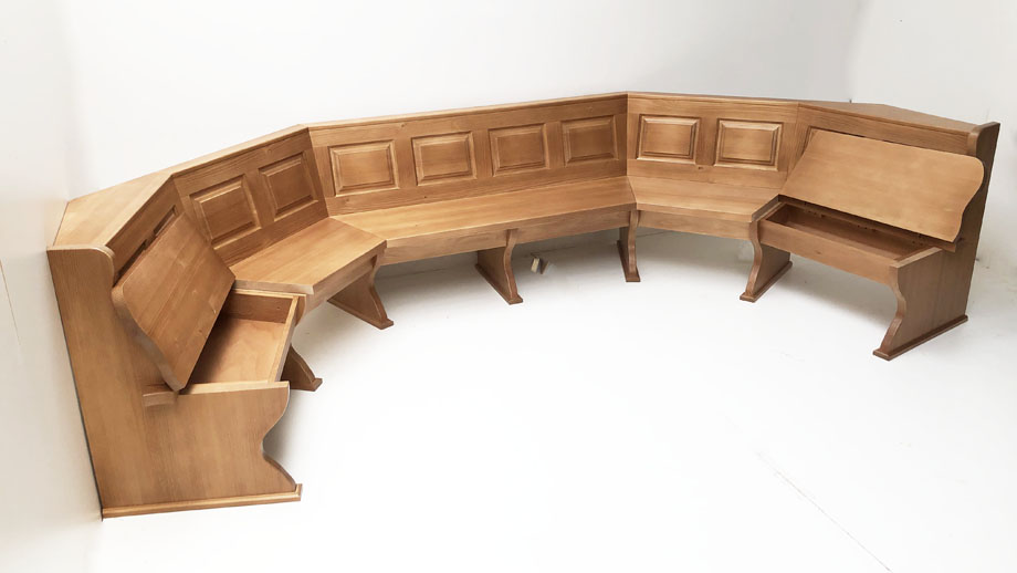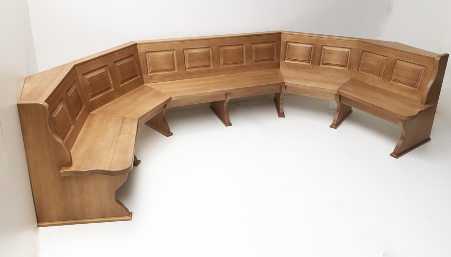 1 Segmentbank mit 5 Segmenten in Abwicklung, gem. Raumplan, Gerade Kasetten, starker Sitz, Kante vorne, starke Wangen 4 cm mit Wischleisten unten,