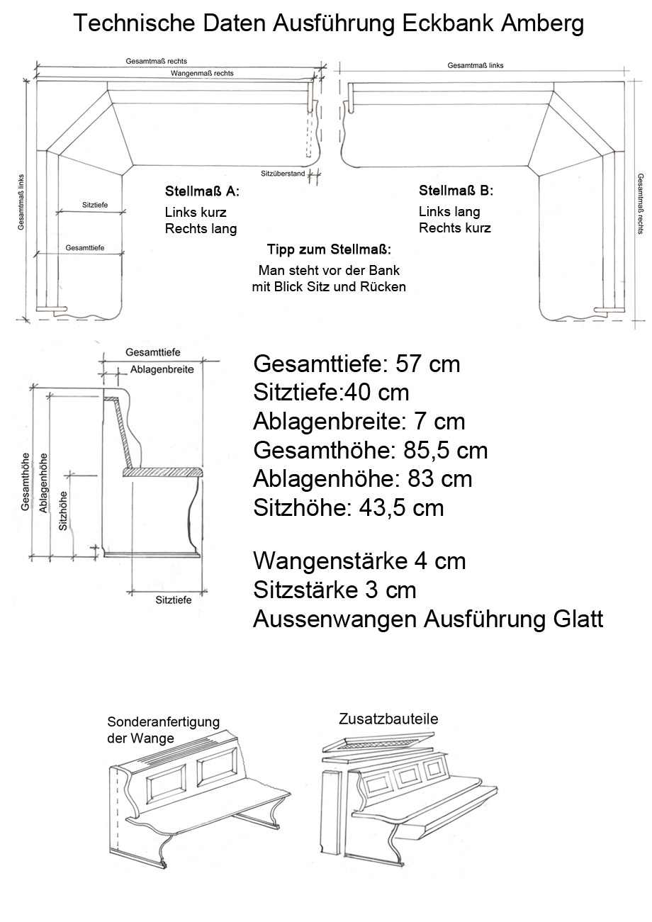 Eckbank 165/125 cm, Gesamthöhe 85 cm, mit Truhen, kurzer Schenkel mit 1 Kassette, langer Schenkel mit 2 Kassetten