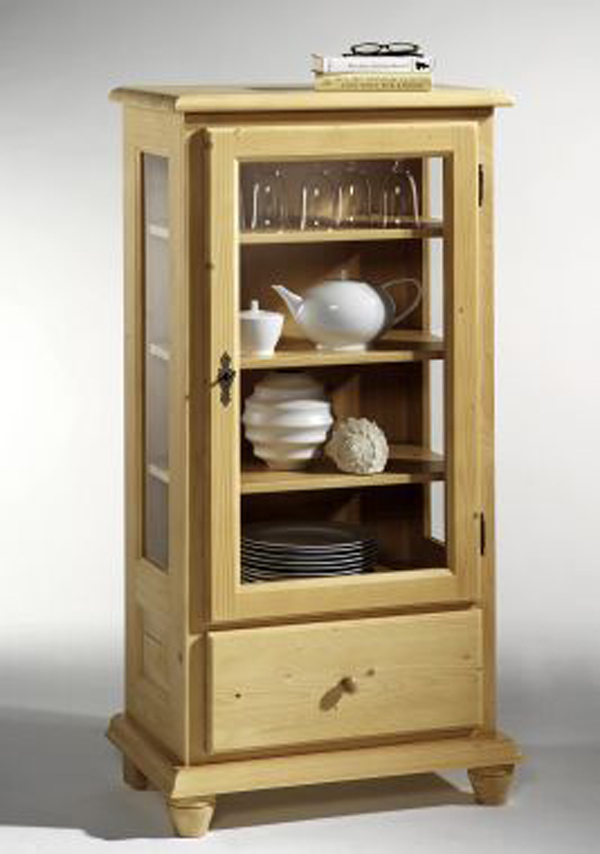 1 Glastüre DIN rechts, seitliche Glasfüllungen, 1 Schubladen Metallknopf und Rosette, Abm. 68/135/43 cm (B/H/T), Fichte massiv, Rosner gewachst
