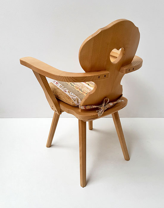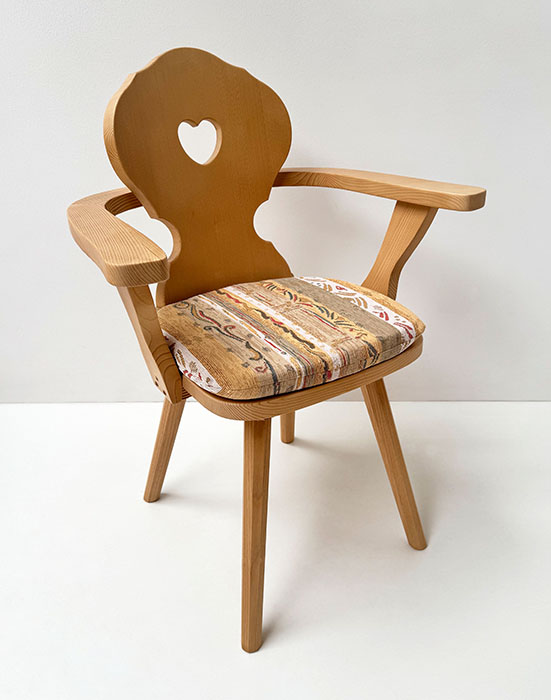 Bauernstuhl Munich, gedrechselter Fuß, Fichte, Rosner gewachst, Polsterplatte, Pocking bordeaux