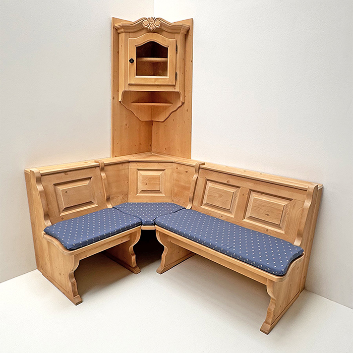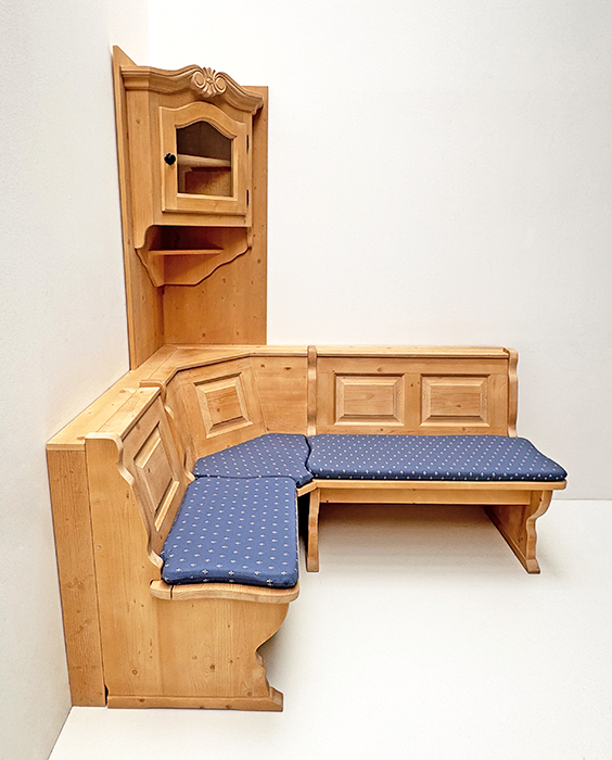 1 Eckbank 125/165 cm mit Truhen, Gesamthöhe 85 cm, wechselseitig stellbar; alles in Fichte massiv, Rosner gewachst
