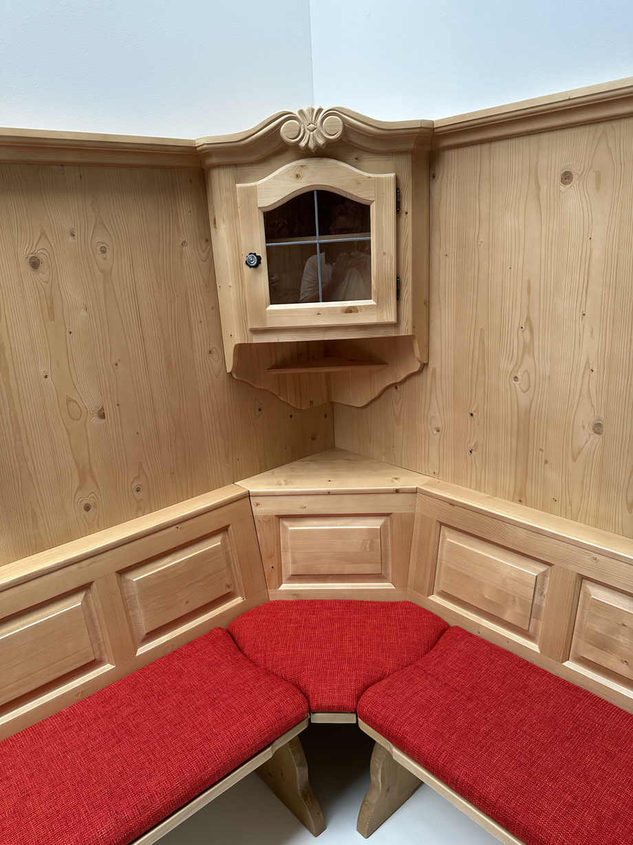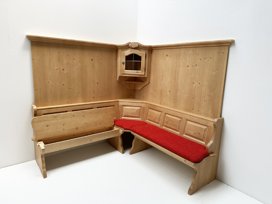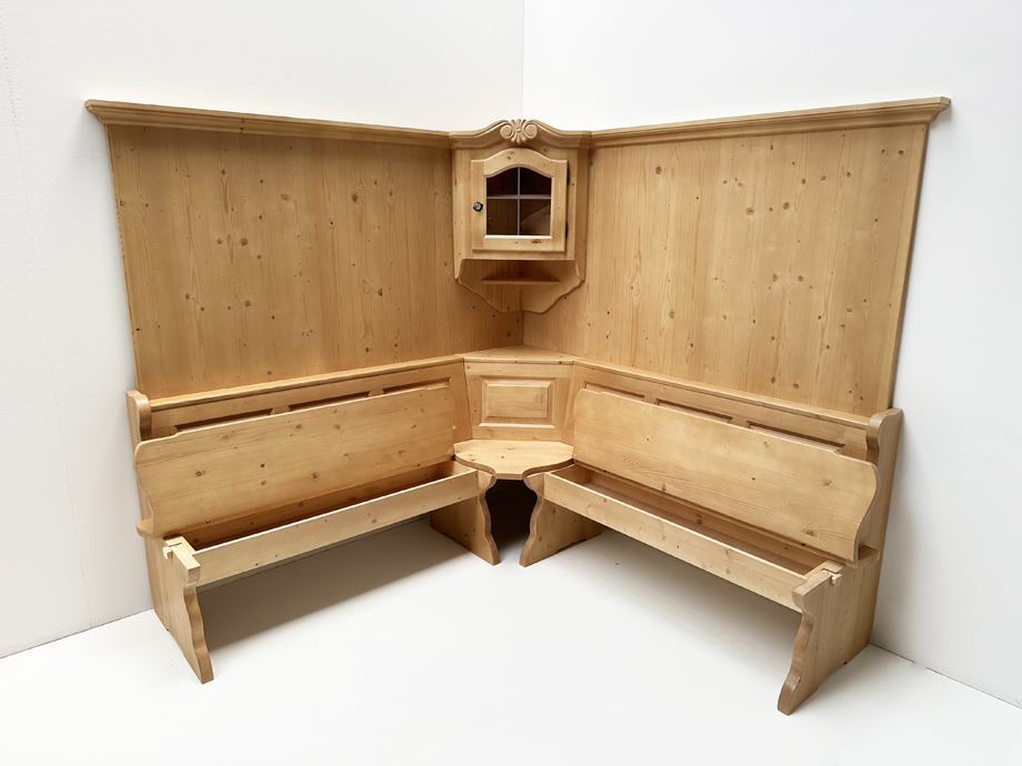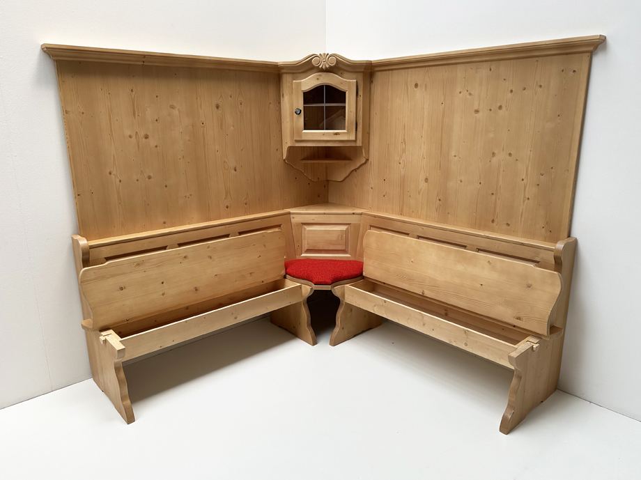 Eckbank Landau solo 195/195 cm mit Truhen aufklappbar, Wandverkleidung und Eckhänger geschnitzt