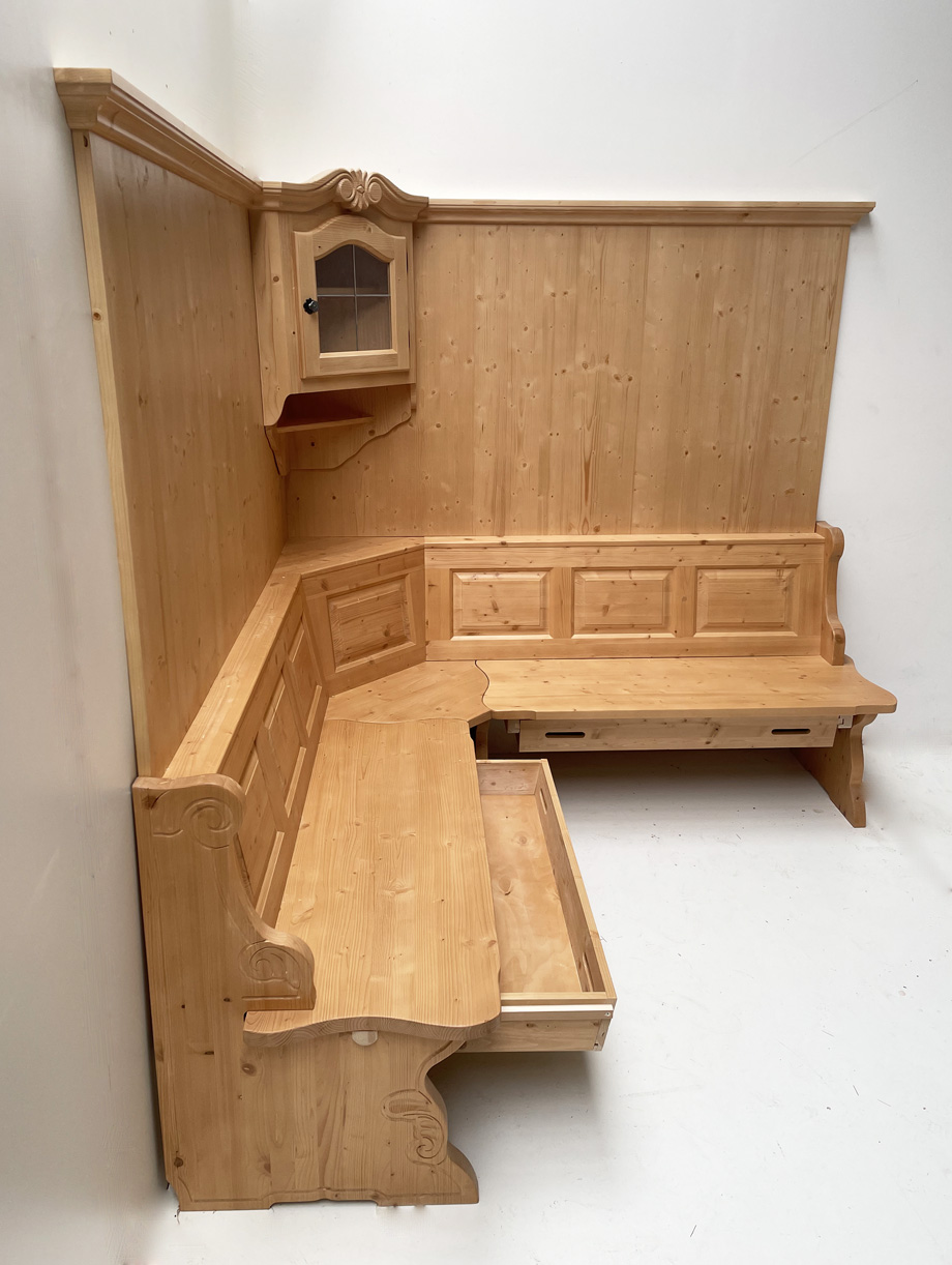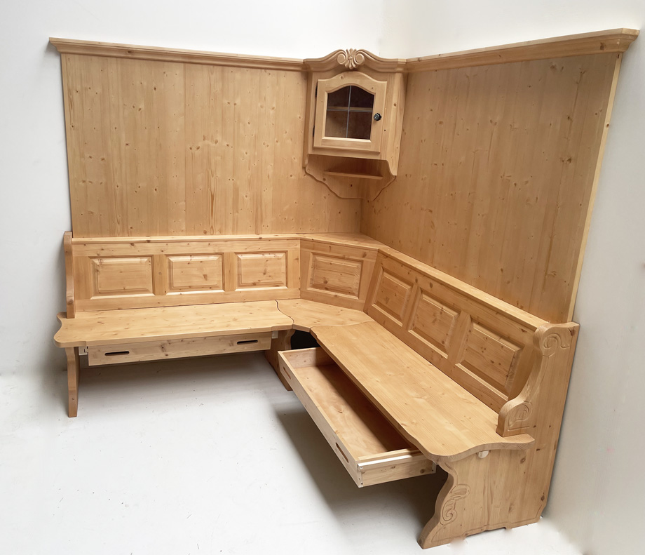 Eckbank Landau solo 195/195 cm mit Truhen aufklappbar, Wandverkleidung und Eckhänger geschnitzt