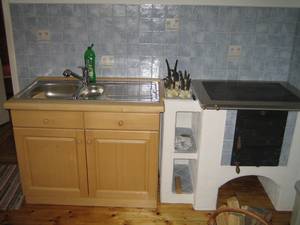 Angepasste Küchenzeile mit Spüle und Stauraumschrank, Arbeitsplatte in massivem Ahorn 4 cm natur geölt Alles in massiver Fichte im Ton Rosner gewachst 83100 Nr. 15 gebeizt und lackiert