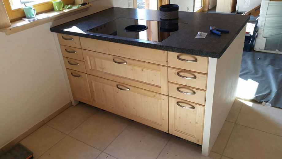 Küchenzeile nach Vorgabe Landhauslust, mit glatten Kasetten, Fichte massiv, Bio Oberfläche, Arbeitsplatten in Granit