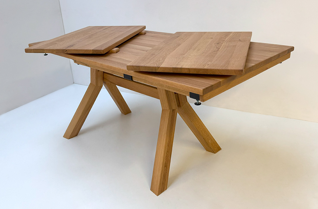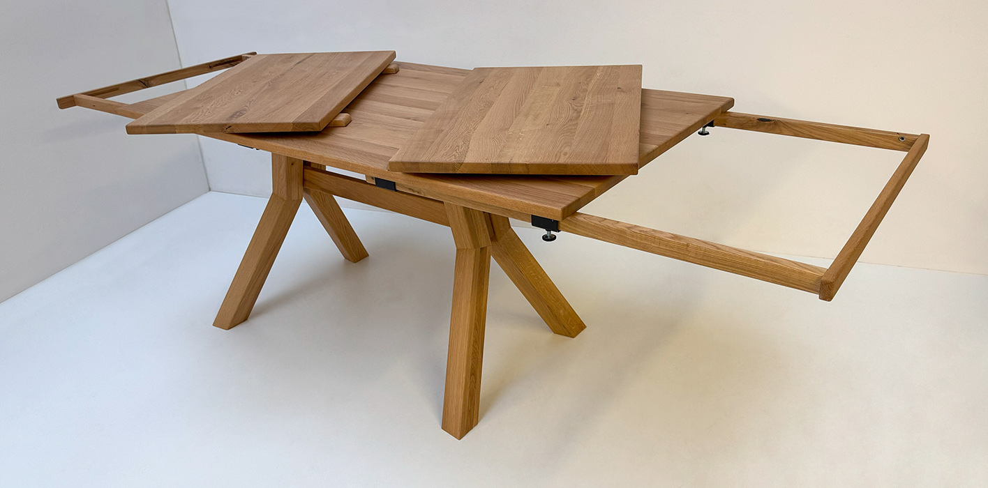 Larissa Tisch 155/85 cm mit 2 Einlegeplatten 50 cm, Auszugsystem Holz, Wildeiche geölt