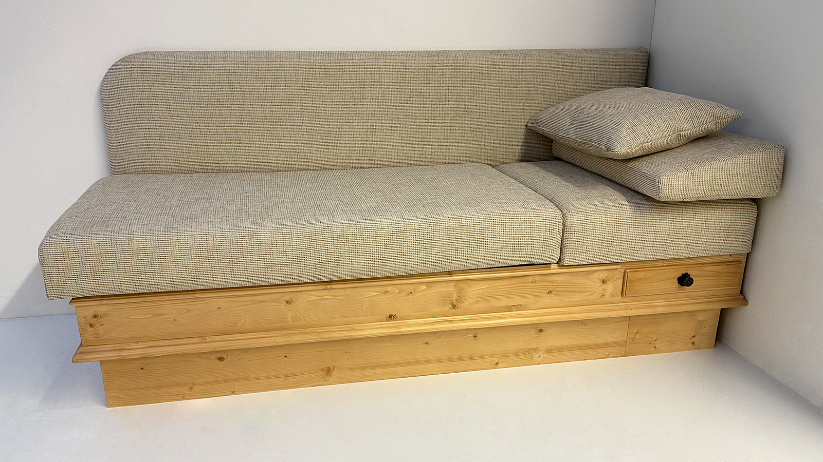 Länge 195 cm, Rücken gerade, Sitz aufklappbar, Kopfteil gerade fest, mit Lehnenkeil aufgesetzt