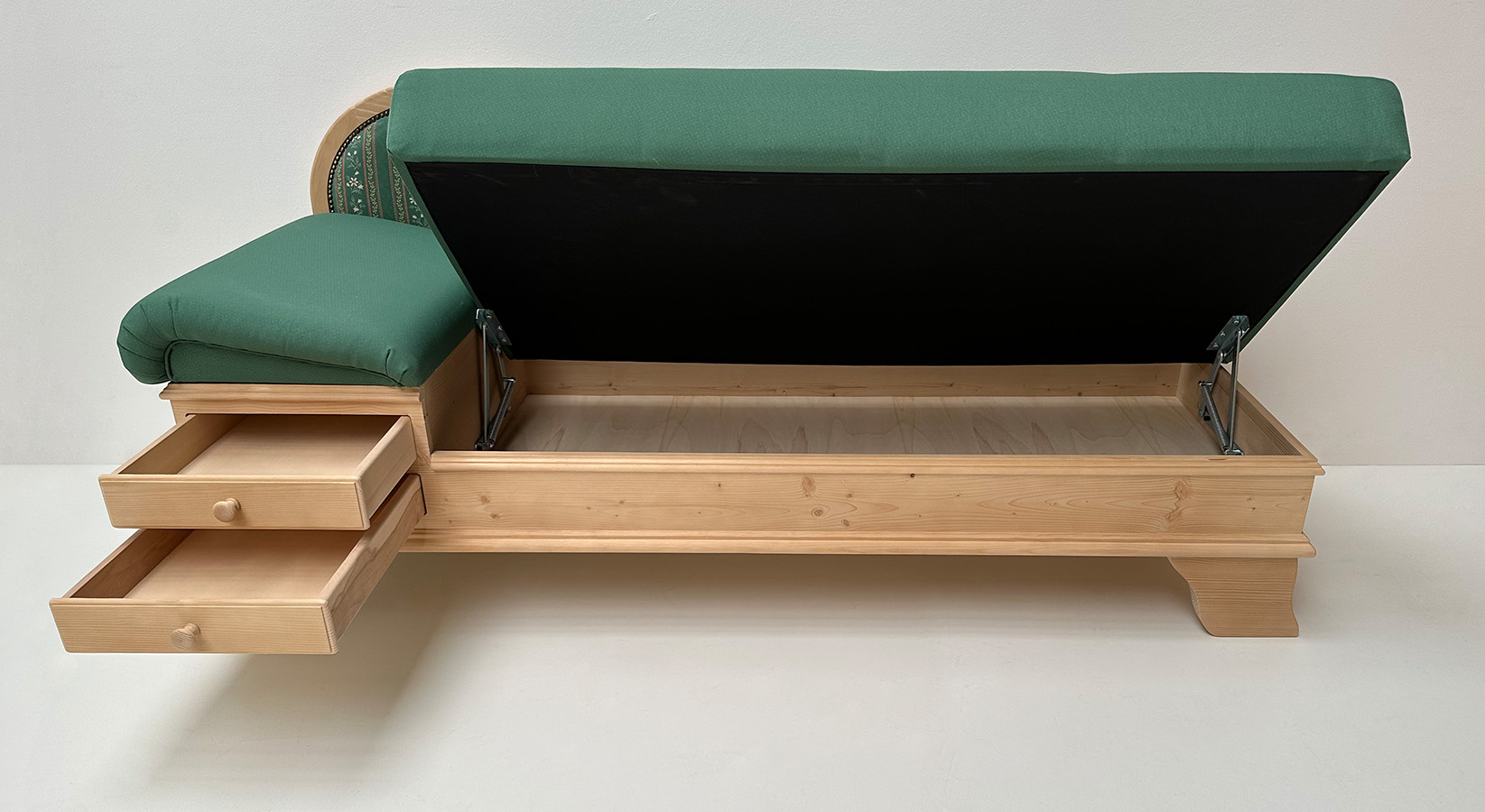 Sitzerhöhung auf 50 cm, Polsterung Komfort Kaltschaum, Kopfteil höhenverstellbar, Sitz mit Klappfunktion, 2 große Schubladen