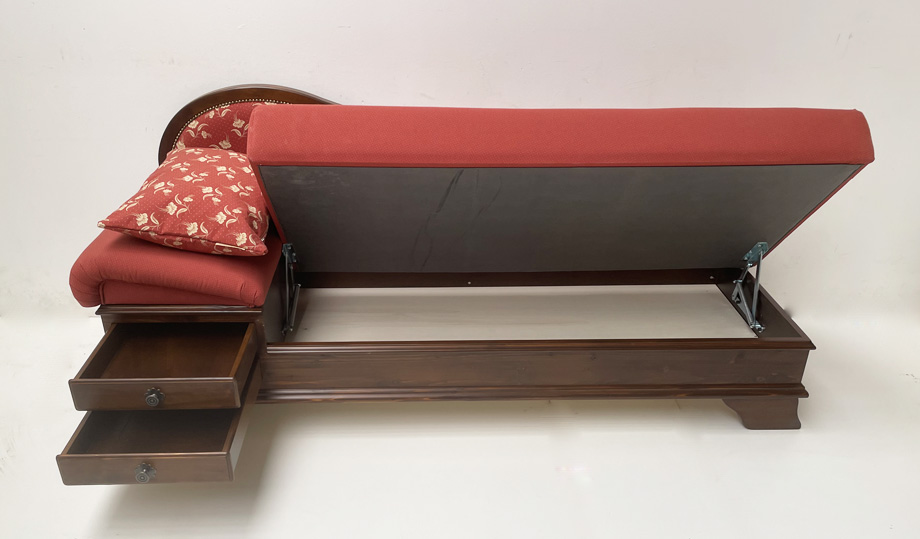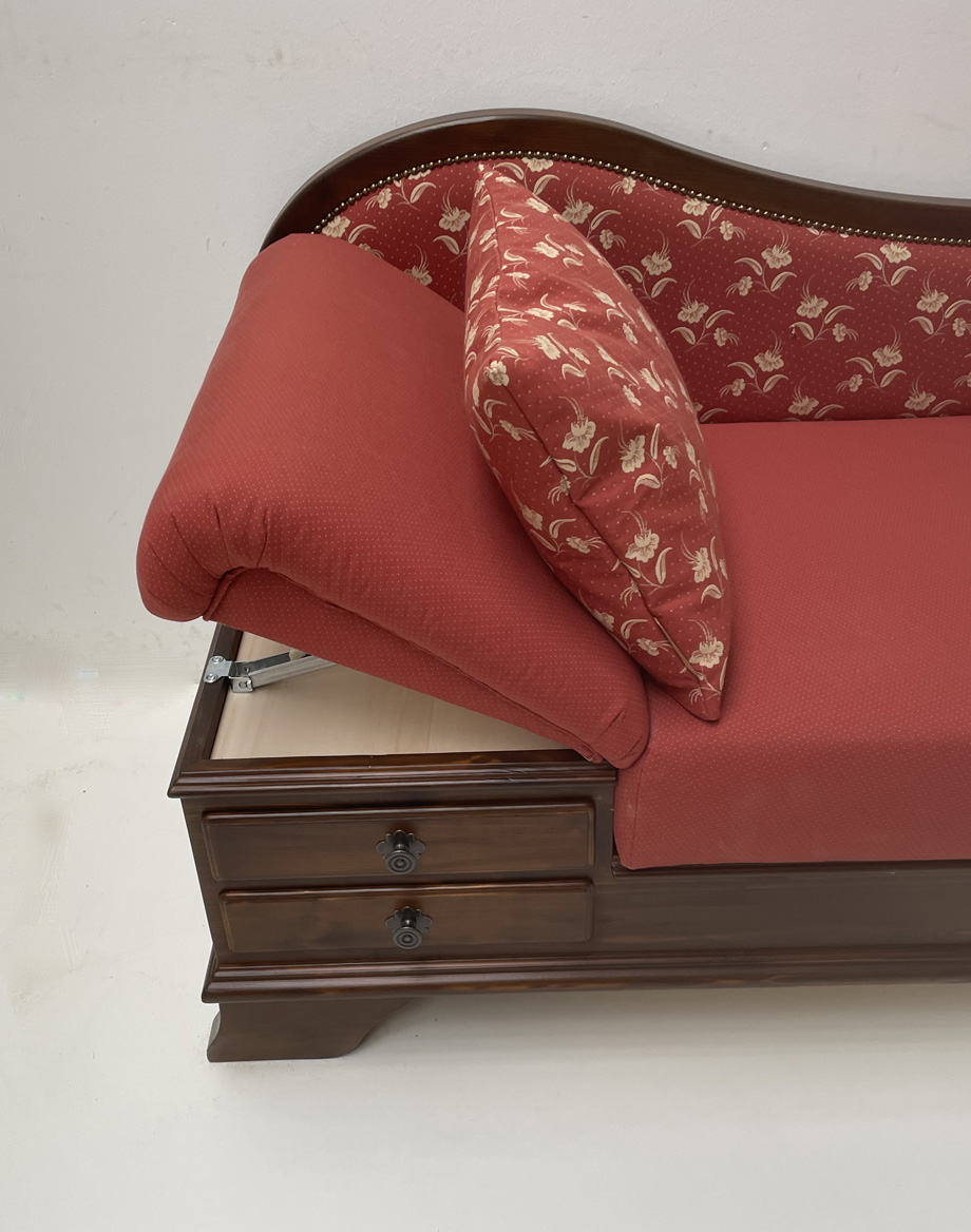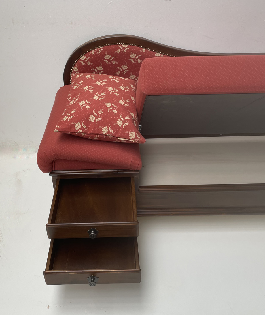 Polsterung Komfort Kaltschaum, Kopfteil höhenverstellbar, Sitz mit Klappfunktion, 2 große Schubladen, Metalknopf und Rosette