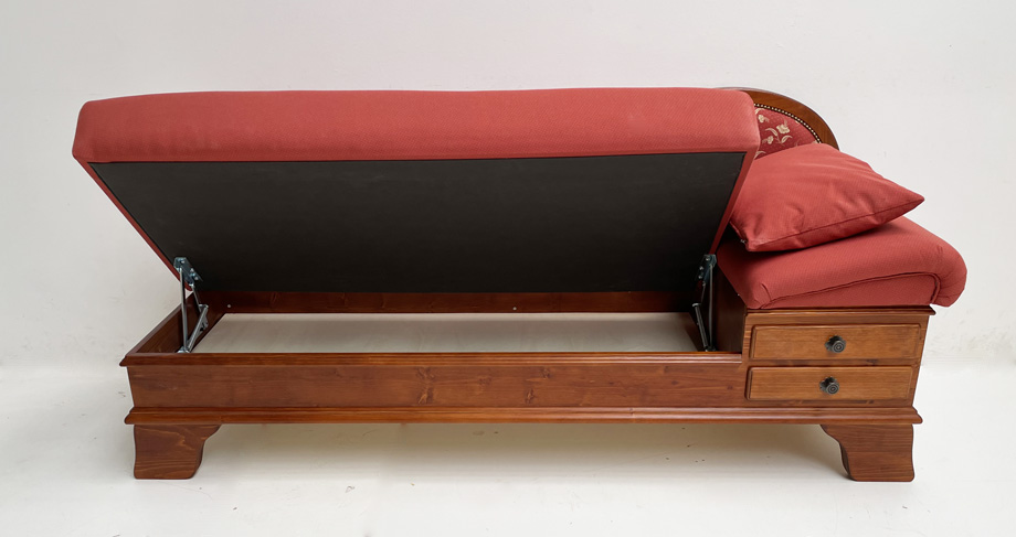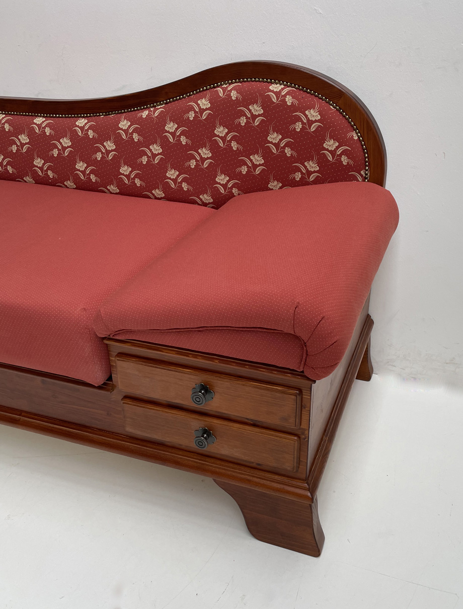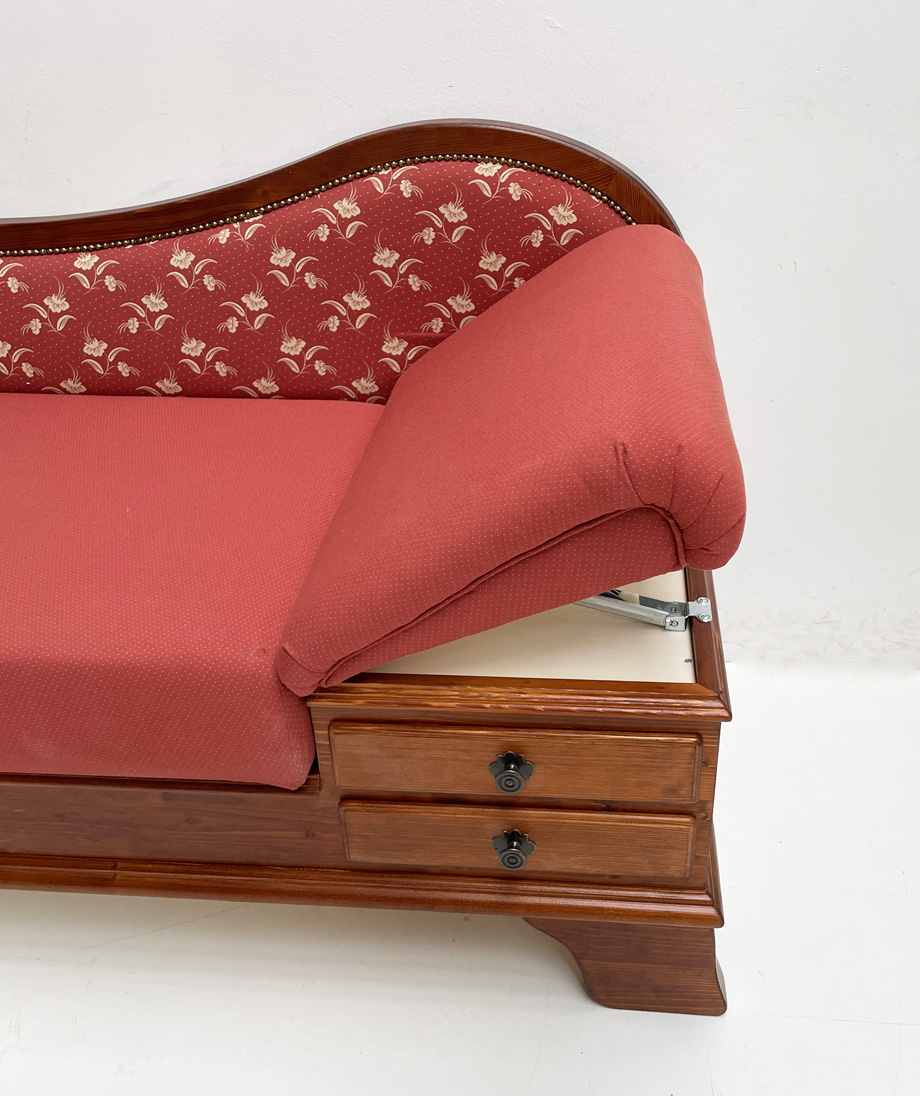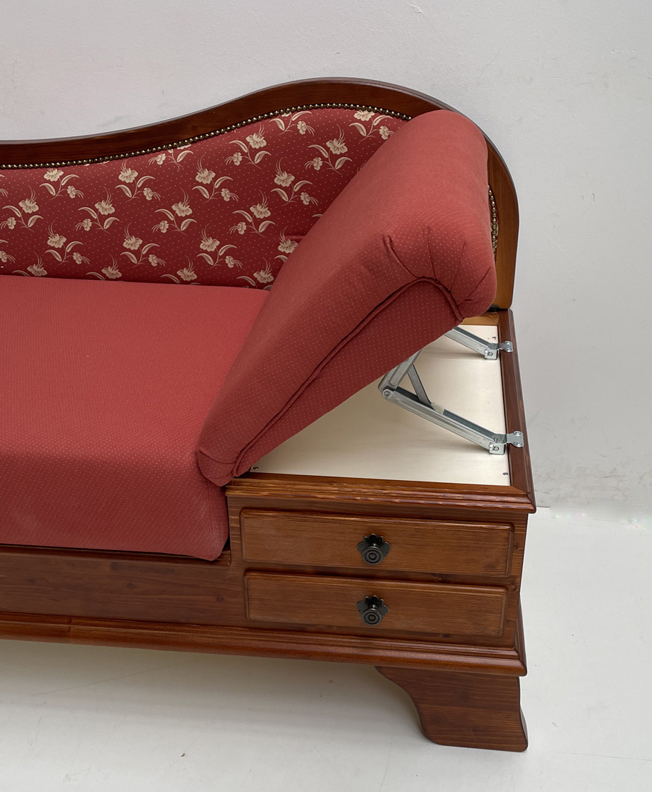 Sofa Liege Garmisch, Tisch, Sitzerhöhung 50 cm, Sonderton Kiefer dunkel, Kössen rot, Wels rot