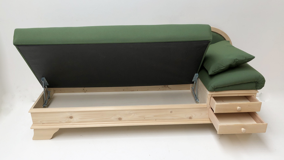 Abm: 195/76/79 cm, (L/T/H), Sitzhöhe 46 cm, Polsterung Komfort Kaltschaum, Kopfteil höhenverstellbar, Sitz mit Klappfunktion, Holzteile: Fichte