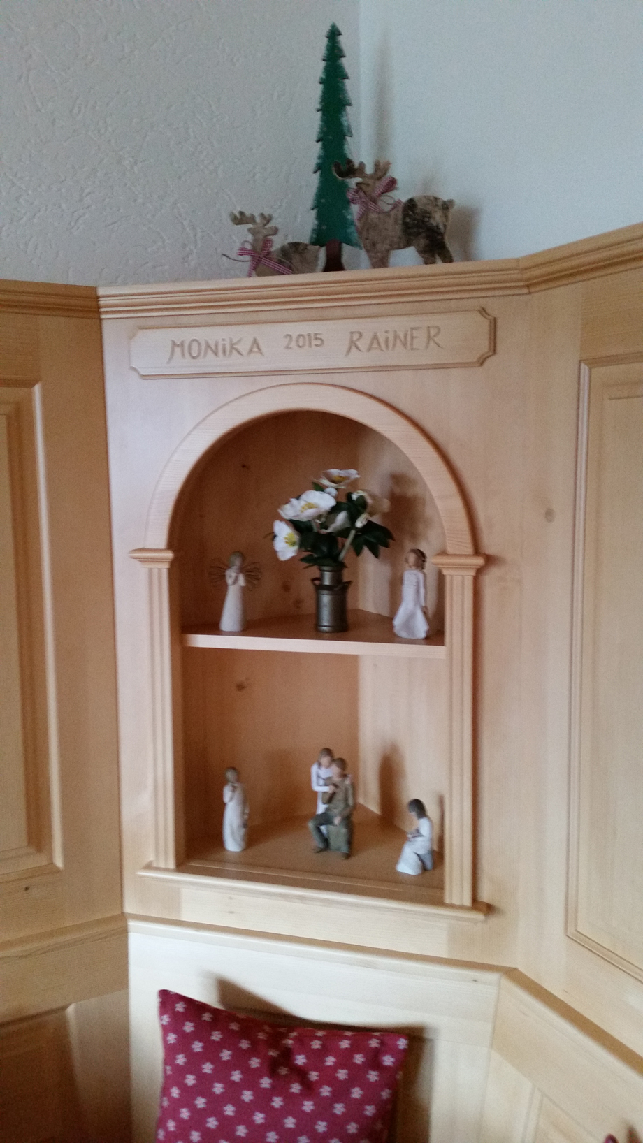 Eckbank LINDAU Eckkapitel mit Schnitzerei, Schriftzug Monika und Rainer