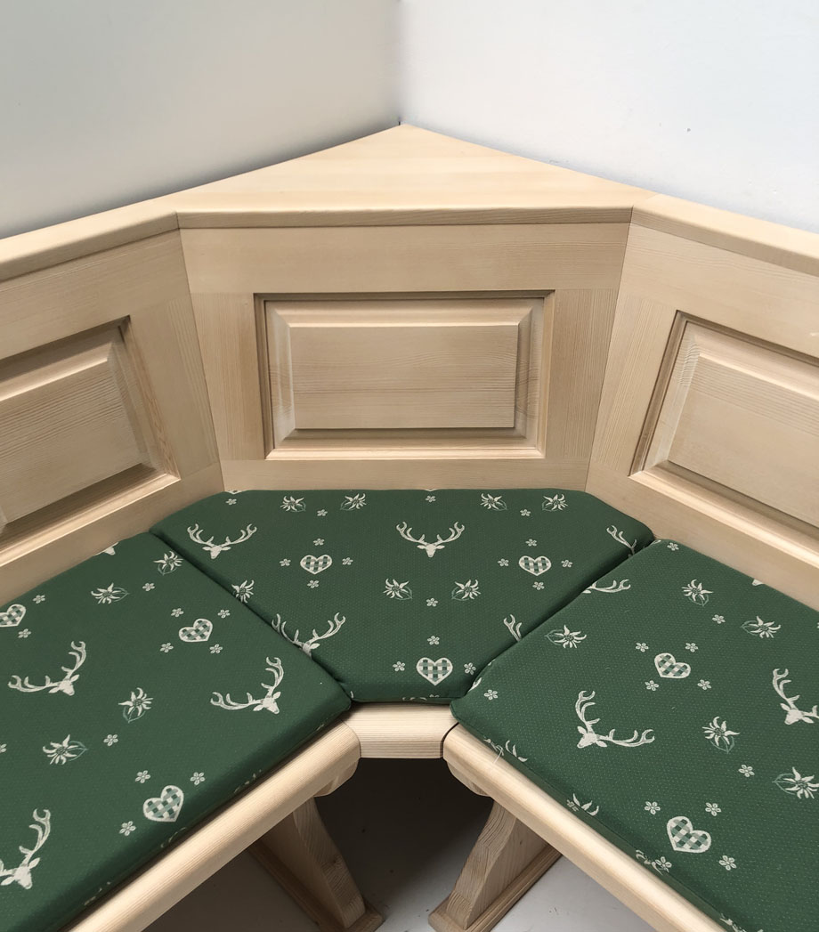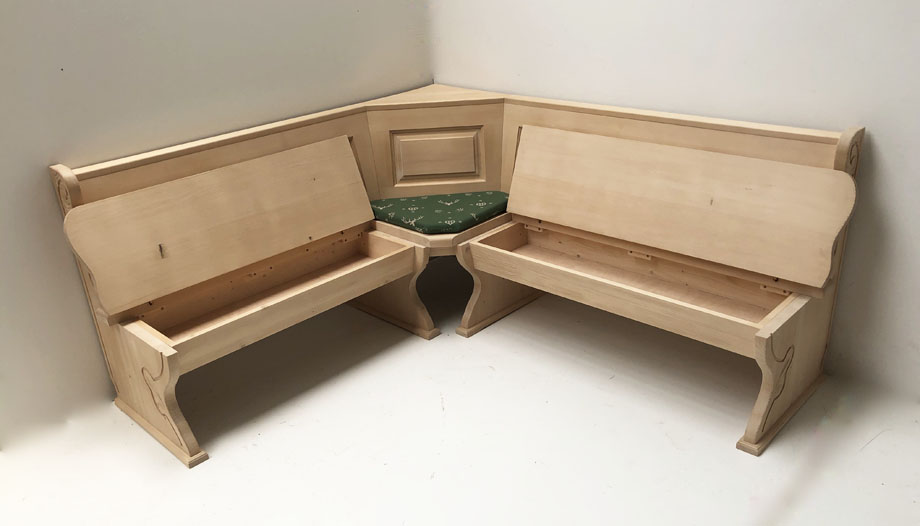 1 Eckbank im Schenkelmaß 180/195 cm, mit Truhen, Aussenwangen geschnitzt