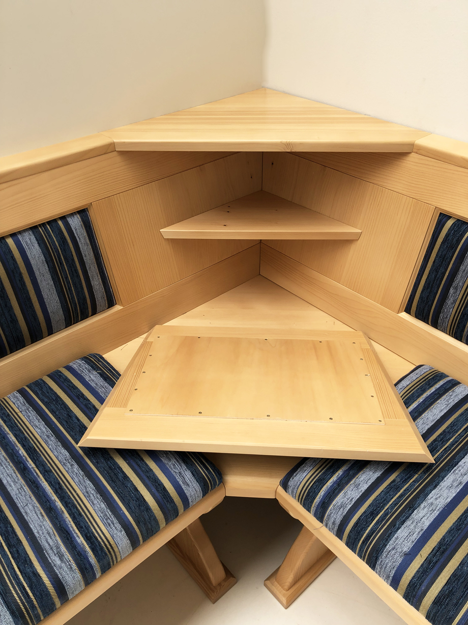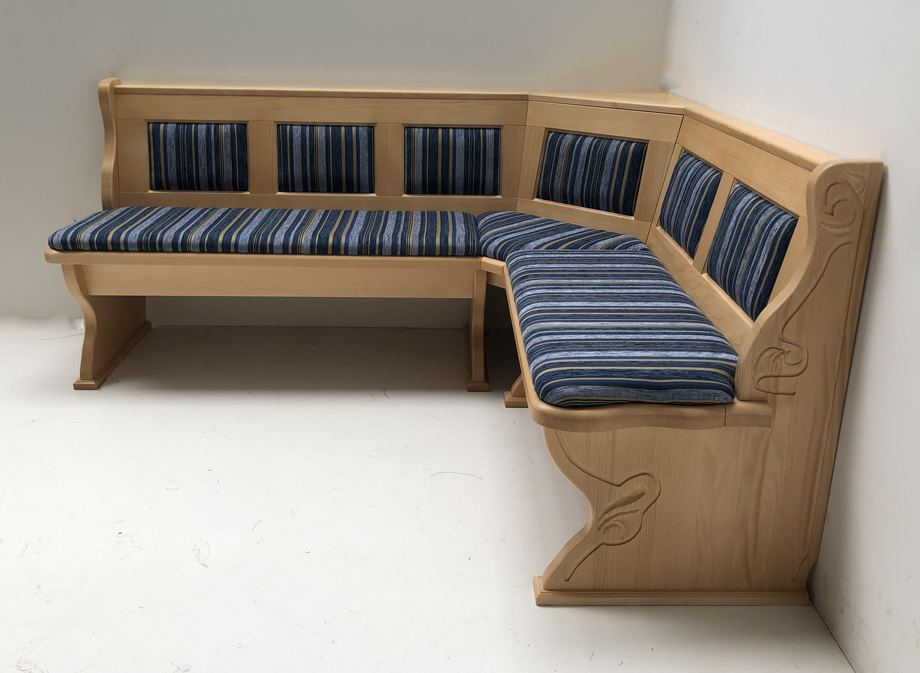 1 Eckbank Lindau, Schenkelmaß Stellmaß B>195/165 cm, mit Truhen, Ecke aufklappbar, Ablagenhöhe 87 cm, Wangenhöhe 89 cm, Aussenwangen geschnitzt