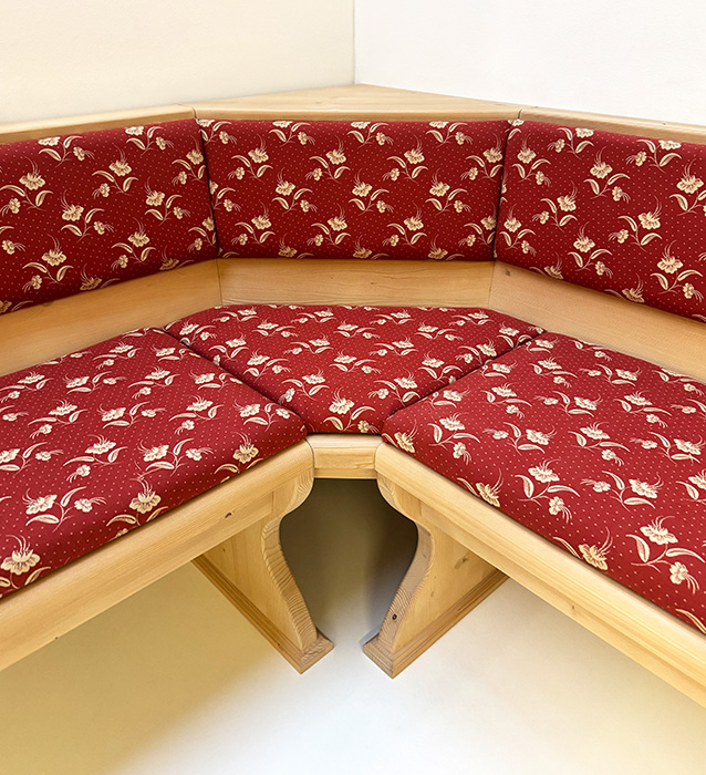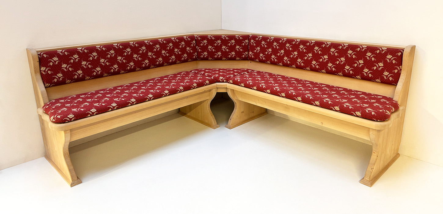 Eckbank Lindau, 200/200 cm, Rücken mit Vollpolster und Sichtholzstreifen, Sitze Polsterplatte, Stoff Kössen rot