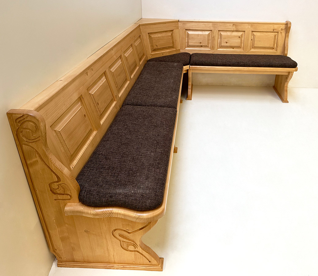 Eckbank Lindau im Schenkelmaß Stellmaß B 300/195 cm, ohne Truhen, Sitz u. Wangen 4 cm, Aussenwangen geschnitzt