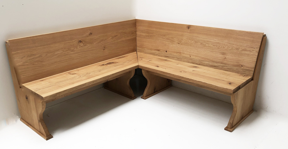 Ecke spitz, d.h. bei dieser Eckbank sind die Schenkel im Eck gestossen, als kein Eckteil,