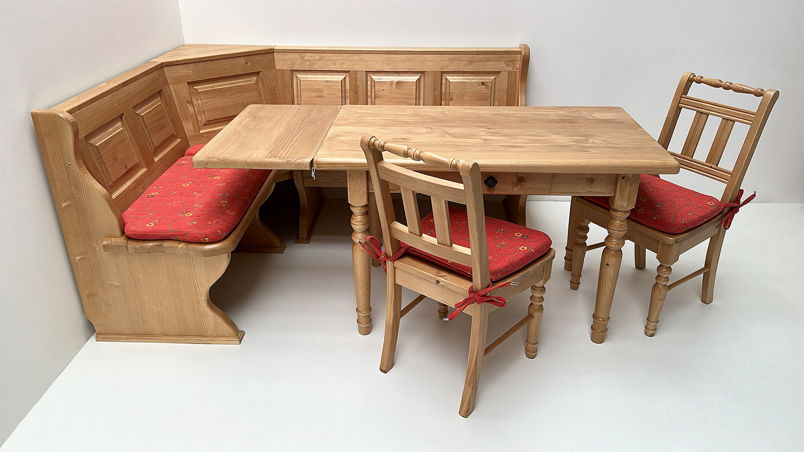 Eckbankgruppe LINDAU 145/185 Fichte, Tisch 4135, 110/70 cm, Stühle 3140, Polster Pöchlarn Ranke rot
