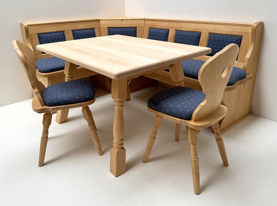Eckbankgruppe LINDAU 150/185 Fichte, Tisch 4510-Amberg, Stuhl Munich, Polster genäht, Kundl grün