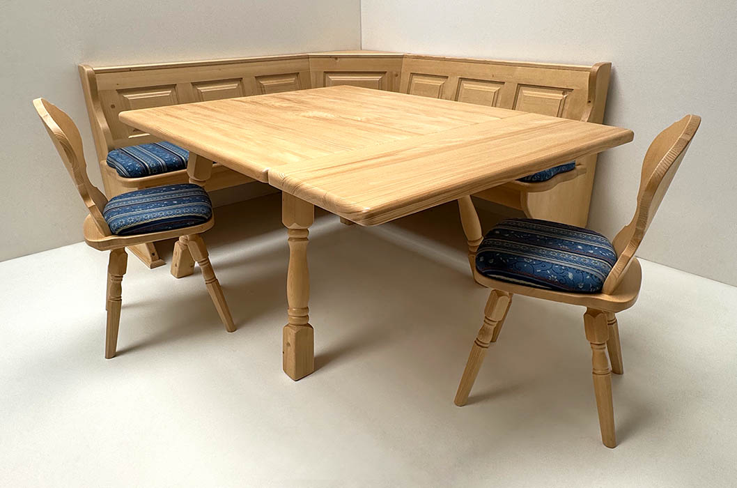 Eckbankgruppe LINDAU 185/185 cm, Tisch 4510-Amberg, Stuhl Munich gedrechselt, Polster genäht TS-7758