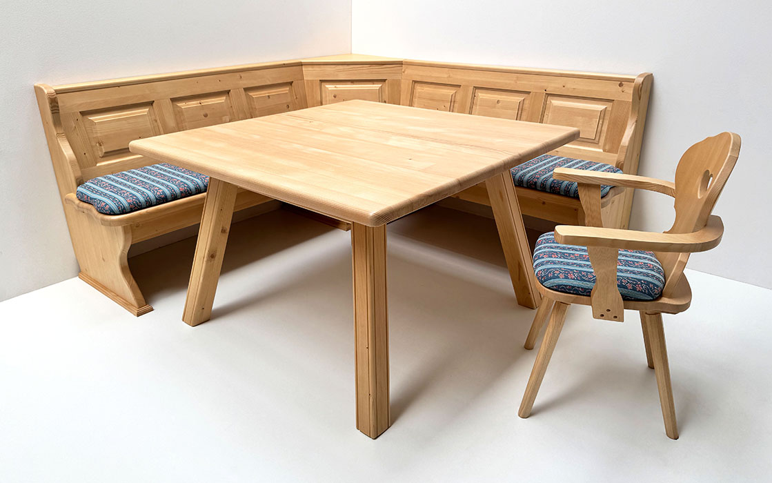 Eckbankgruppe LINDAU 195/195 Fichte, Tisch 4510G, Fichteplatte, Armlehnstuhl Munich, Waidhaus blau
