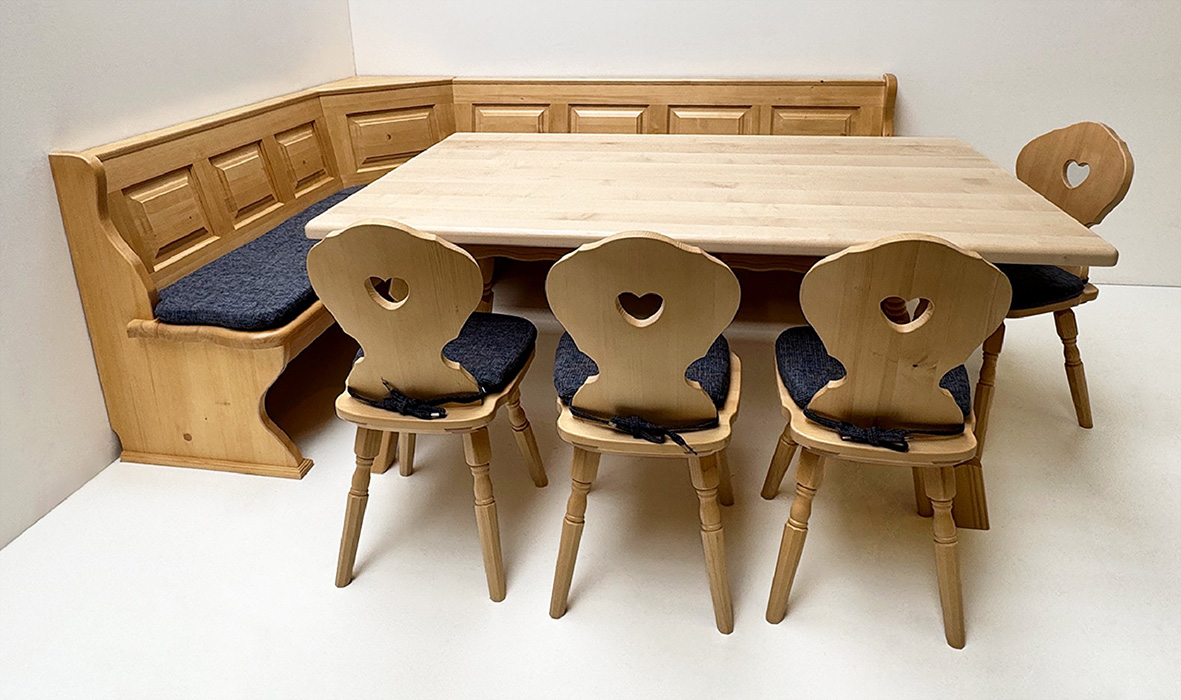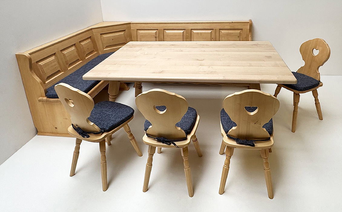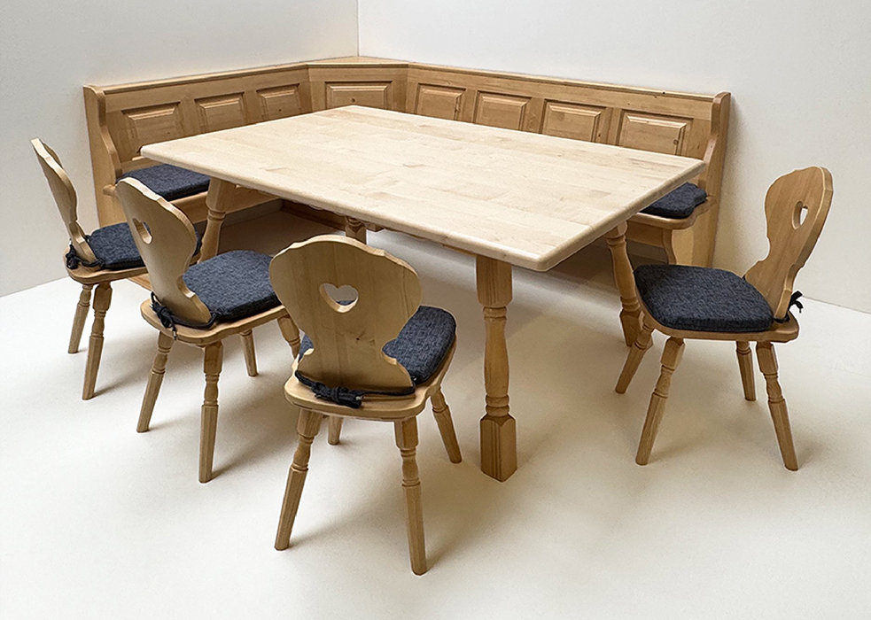 Eckbankgruppe Lindau, Fichte massiv, Tischplatte Ahorn natur lackiert, alles Rosner gebeizt und lackiert