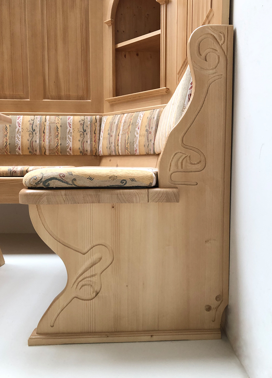 Eckbank Lindau 185/300 mit Truhen aufklappbar, Wangen geschnitzt, Polsterplatten, Mülheim Streublume