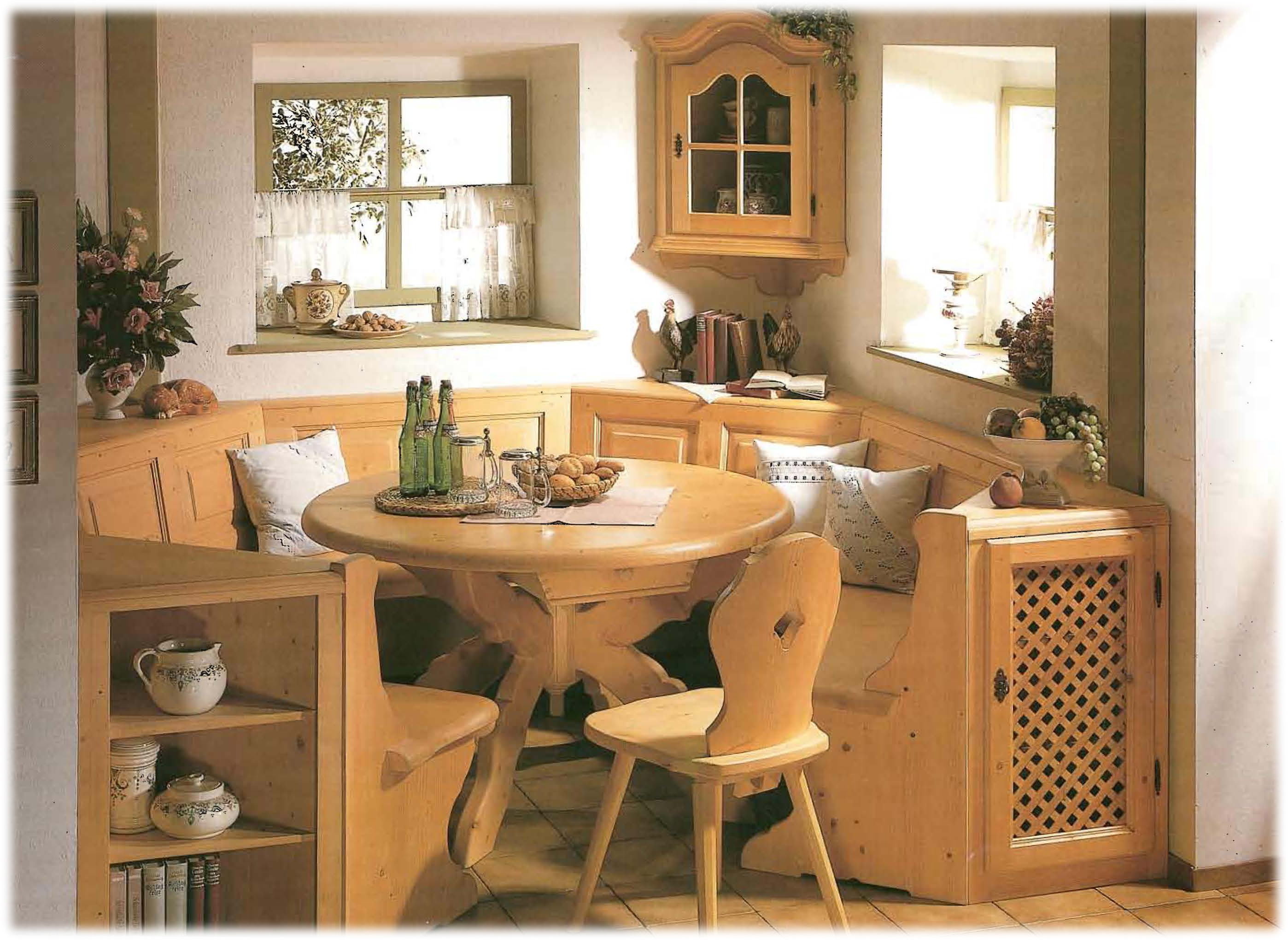 Segmentbankgruppe Lindau in massiver Fichte im Farbton Rosner gebeizt und lackiert bestehend aus: 1 Segmentbank im Schenkelmaß 205/240/205 cm, 1 Abschlußregal offen links, 1 Abschluß regal rechts mit Gittertüre, 1 Kreuzfußtisch mit Rundplatte 110 cm