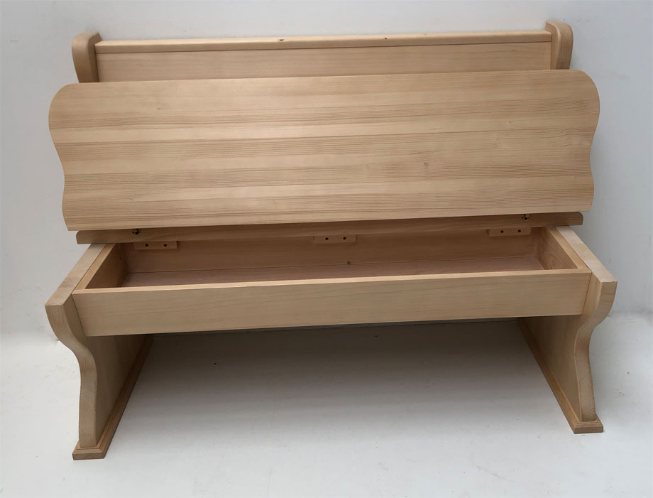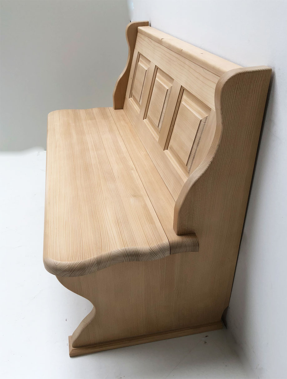 Einzelbank Lindau 135 cm, mit geraden Kasetten, hi Ablagenhöhe 87 cm, Wangenhöhe 90 cm, Aussenwangen glatt ( auch geschnitzt lieferbar !)