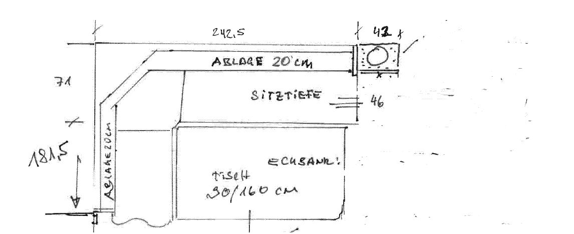 1 Eckbank gem. Skizze Schenkelmaß 175/240 nach Laufmeter, beidseitige Ablagenverbreiterung 20 cm