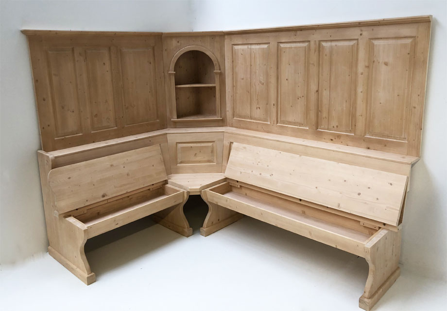 Eckbank LINDAU 195/195 Wandverkleidung mit Eckkapitel, extra tiefe Truhen, oben tiefes Bord 14 cm !