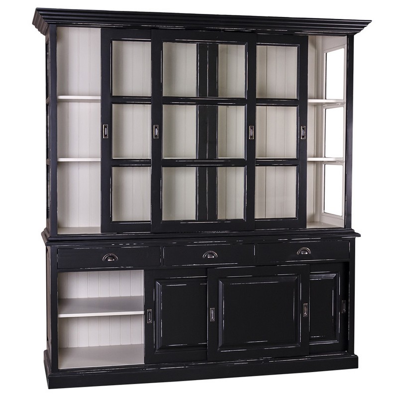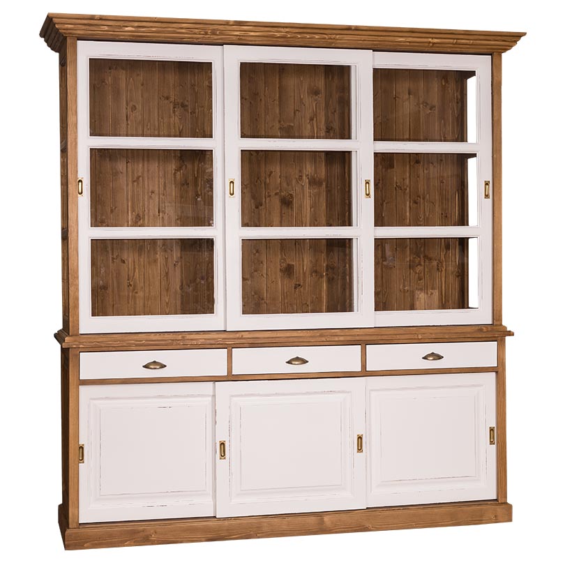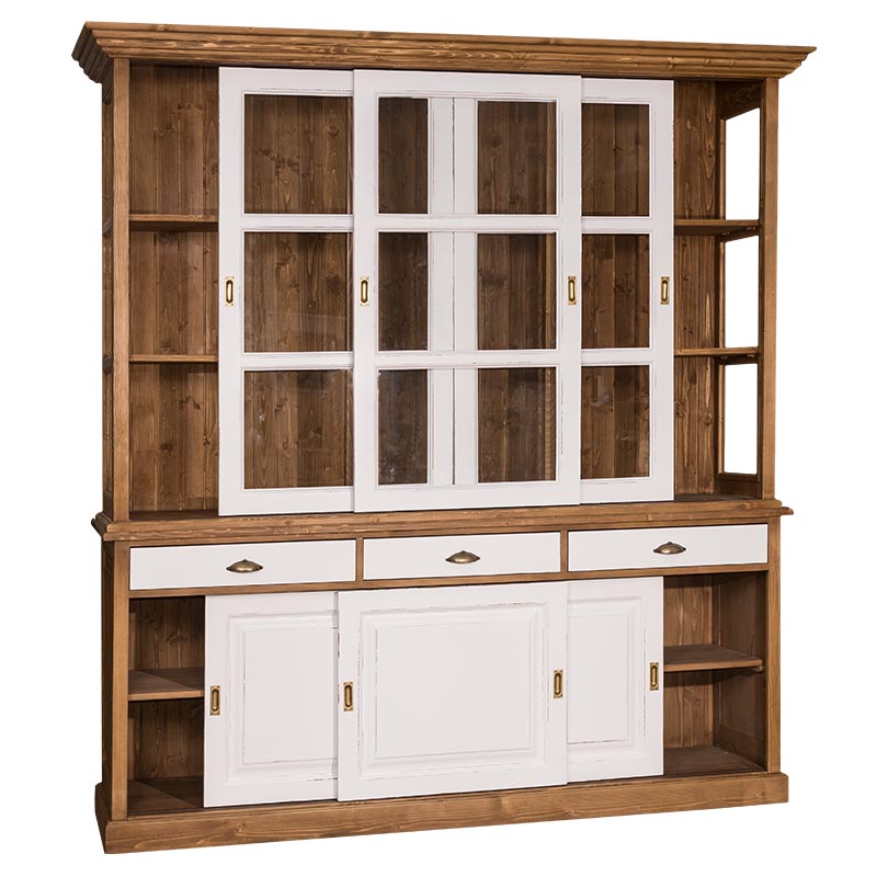 Buffet, Vitrine, Anrichte + Aufsatz, Schiebetüren, 3 Schubladen, Kiefer massiv zweifarbig