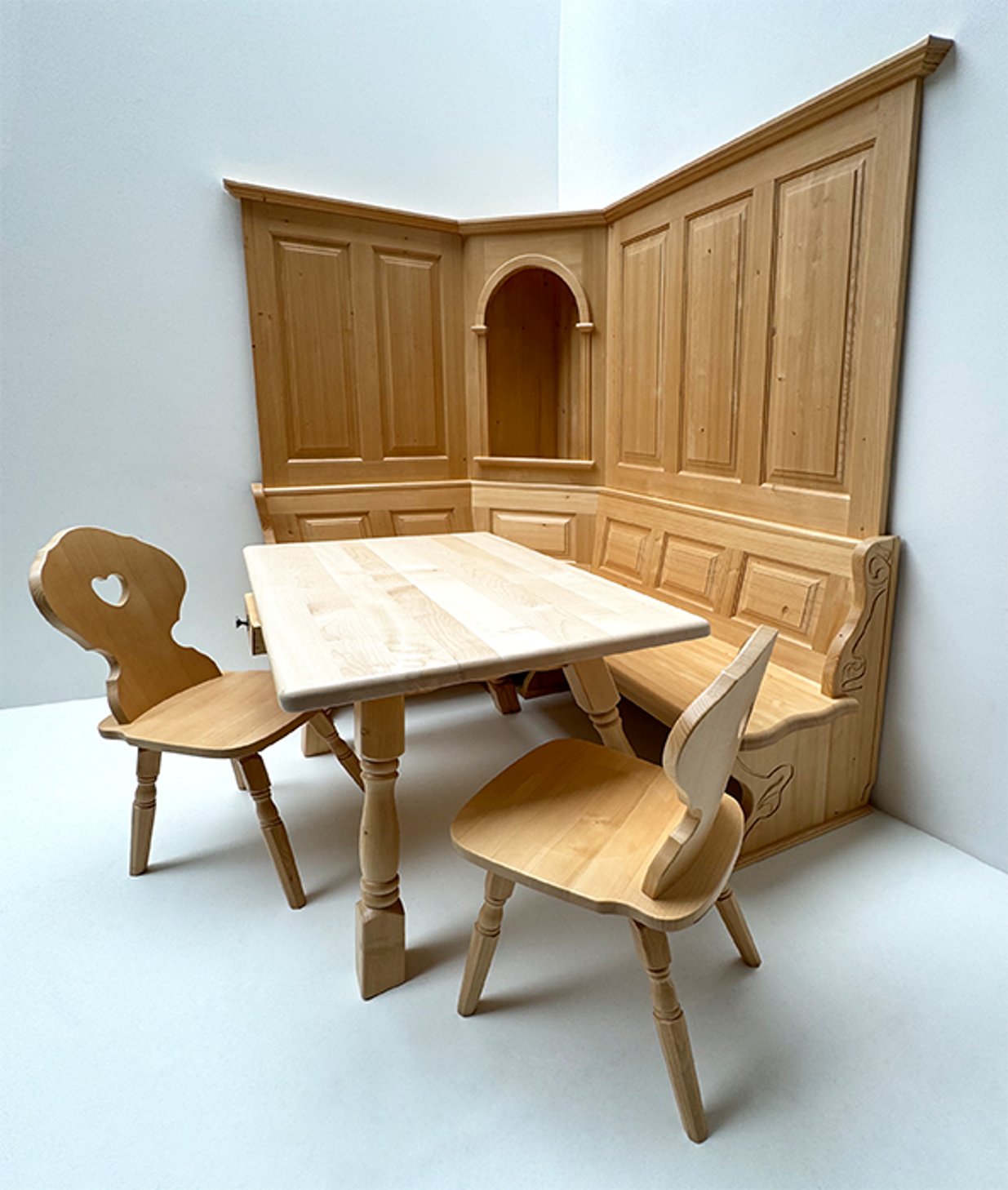 Eckbankgruppe Lindau 140/185cm, Truhen, Wandverkleidung, Tisch 80/120 cm, Ahornplatte,Stühle Munich
