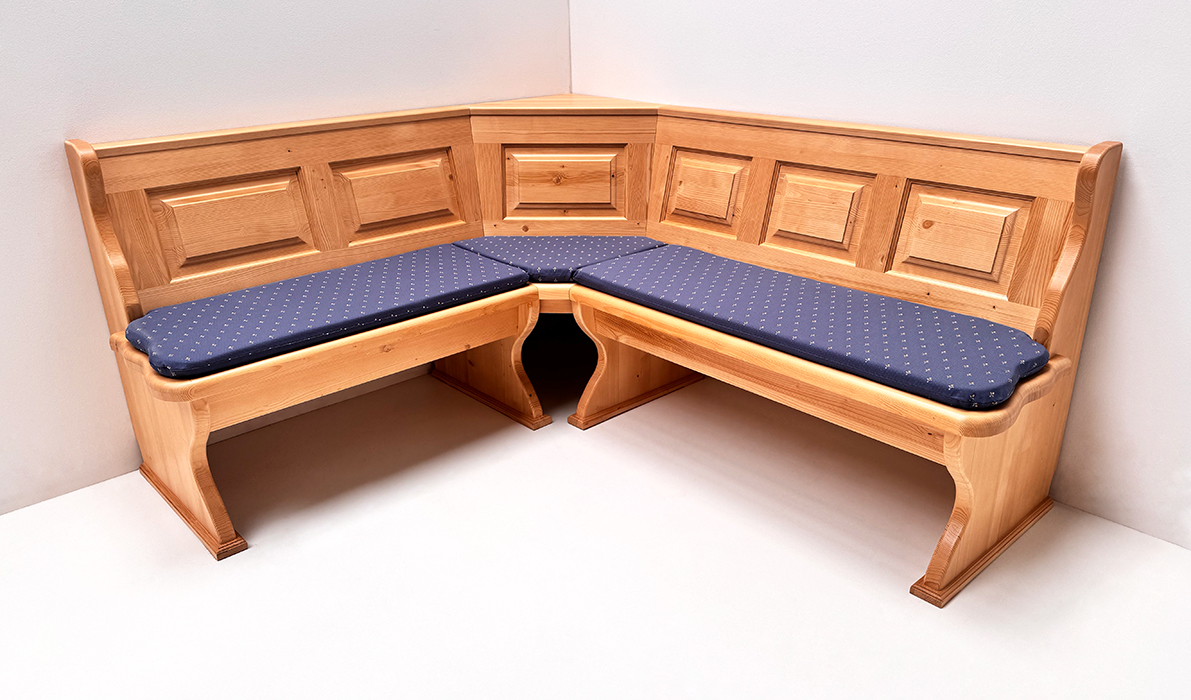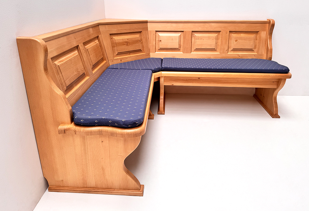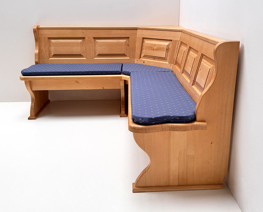 Eckkbank Lindau 165/185 cm, Wangenhöhe 89 cm, Ablagenhöhe 87 cm, Ablage standard 6 cm, Sitz- und Wangenstärke 4 cm gerade Holzkassetten
