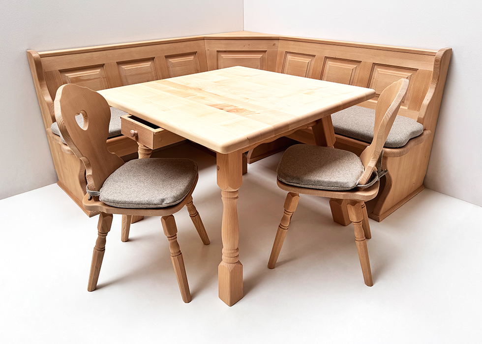 Eckbankgruppe LINDAU 185/185 cm, Tisch 4510-Amberg, Stuhl Munich gedrechselt, Polster Loden TS-3430